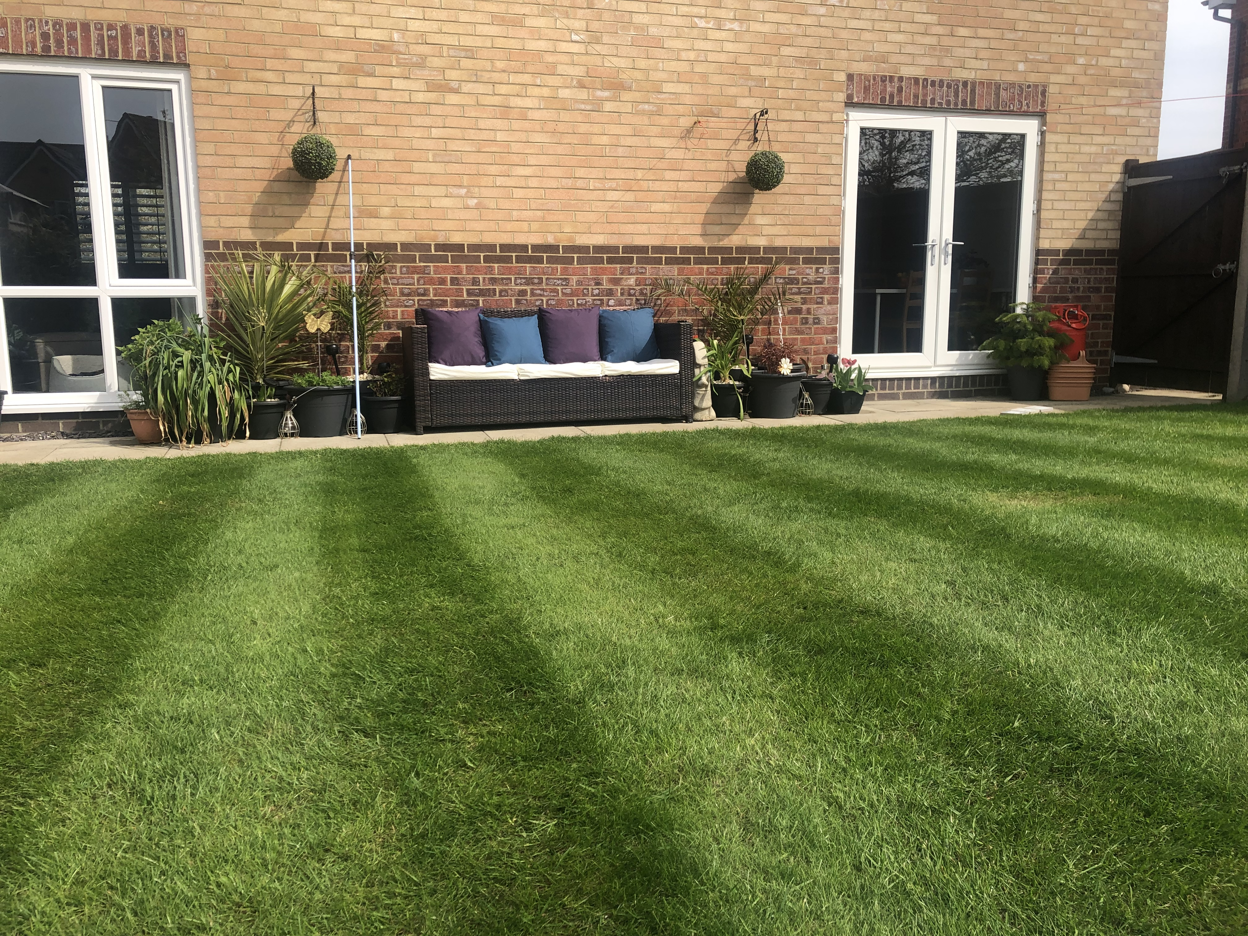 Now;two rows of concrete paving slabs behind house and rest is grass