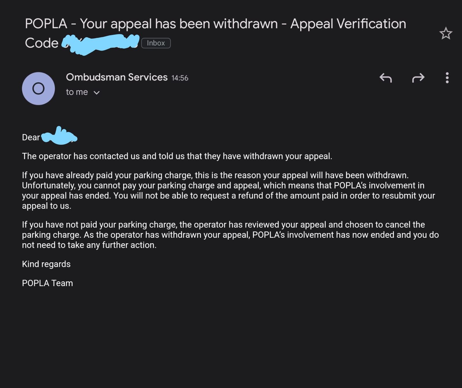 Success! Premier Park has withdrawn its appeal and cancelled the parking charge. Presumably to avoid a negative decision ...