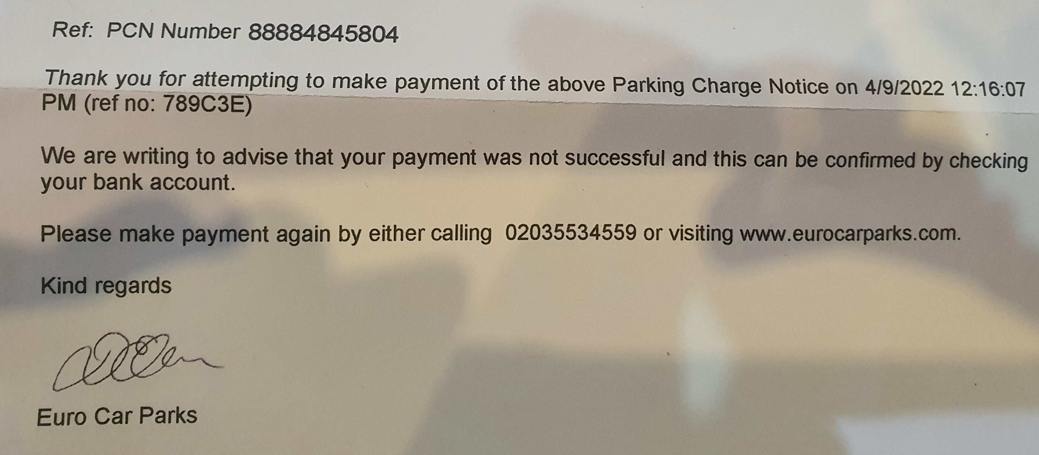 I have just received a letter from Euro car parks saying my attempted PCN payment failed 4/9/22 and to either phone or go online to try again. I'm assuming the date format is American although the actual letter is dated 14th April 2022.