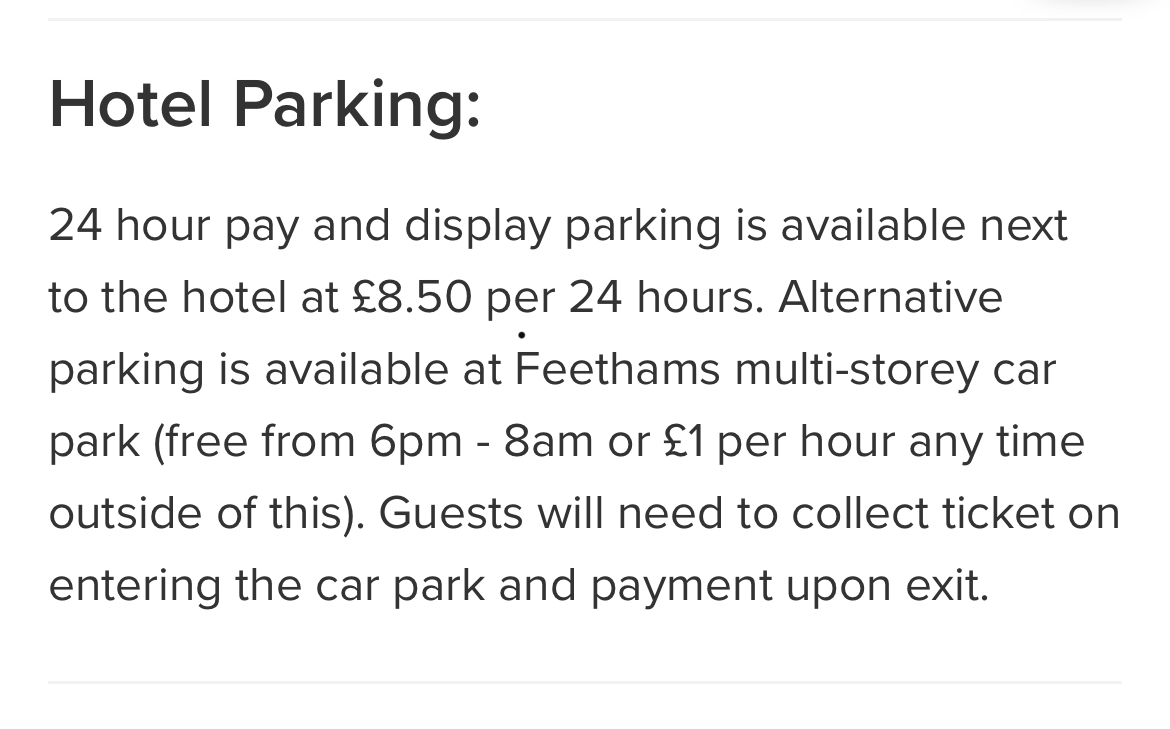 This is the screenshot regarding the hotel parking from the website. We of course used the recommended first option which the hotel directs you to for the 24hr pay and display parking: