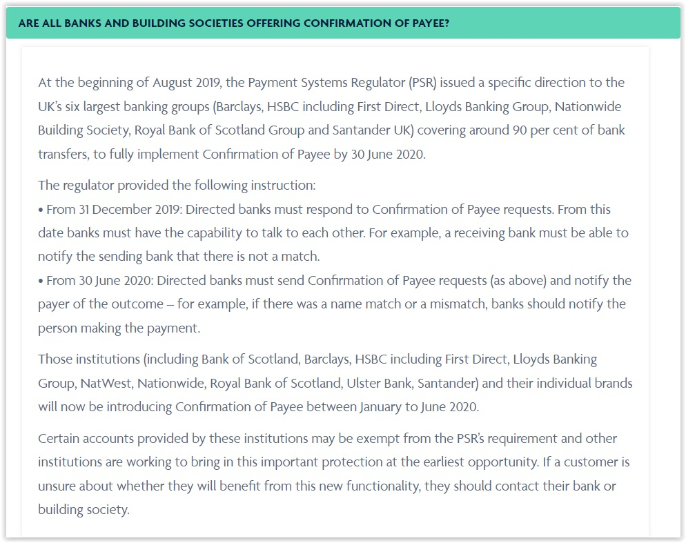 The Confirmation Of Payee (COP) - thing has only been implemented by very few banks. Most Building Societies and most other savings providers are not currently participating, and probably never will.Bigwheels1111 said: