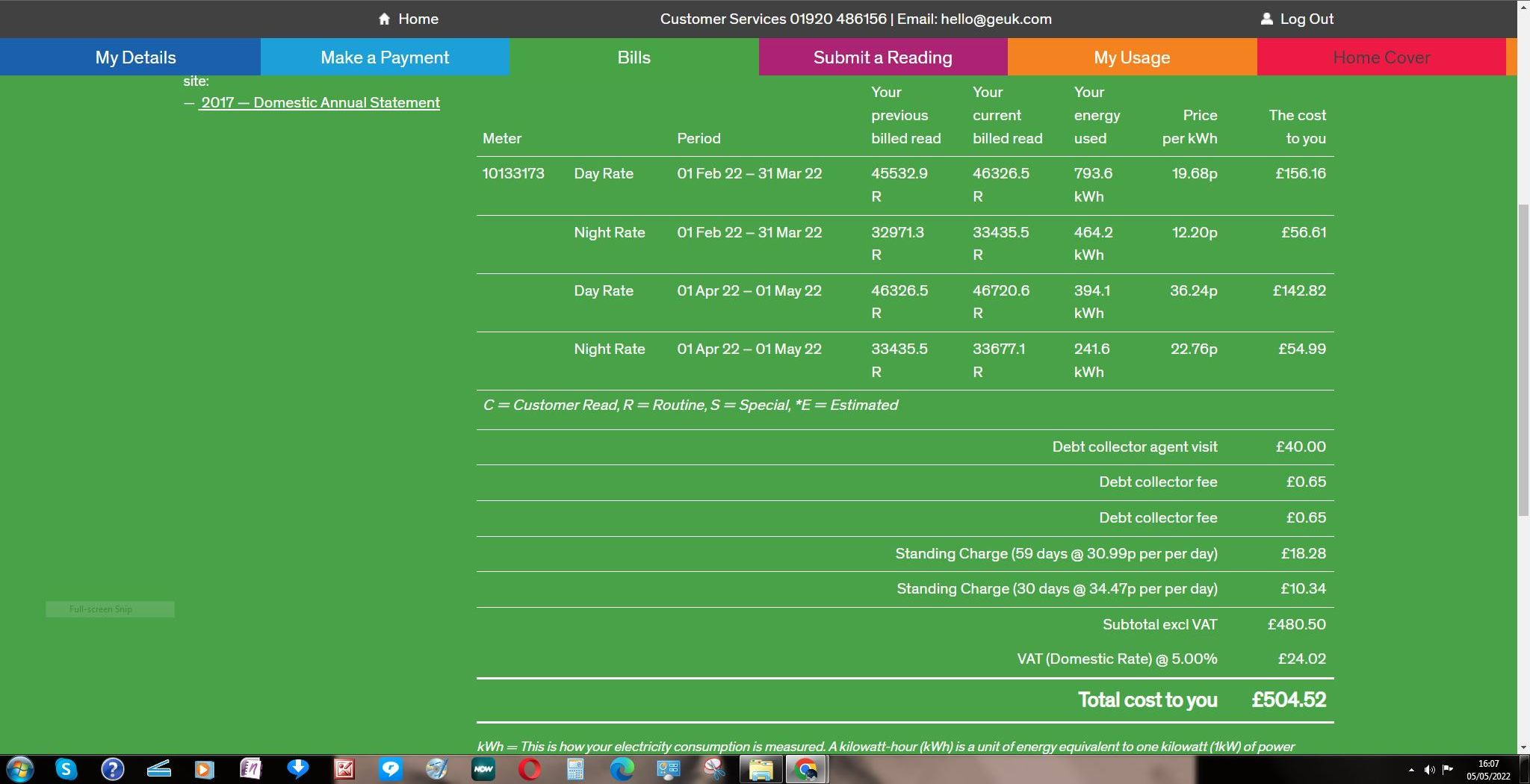i pay 116.00 direct debit to green energy every month, i have just got this months bill and i will not be able to pay this £504 im a single parent with 2 children one with SEN and disabilities i am struggling as it is but now this huge bill that i can not pay is really knocked me for six, i am entitled to warm discount but my energy provider does not except it i do not have access to a meter reading, i dont know why i'm posting this nothing is going to change every month im going to get deeper and deeper into debt that i cant cope with