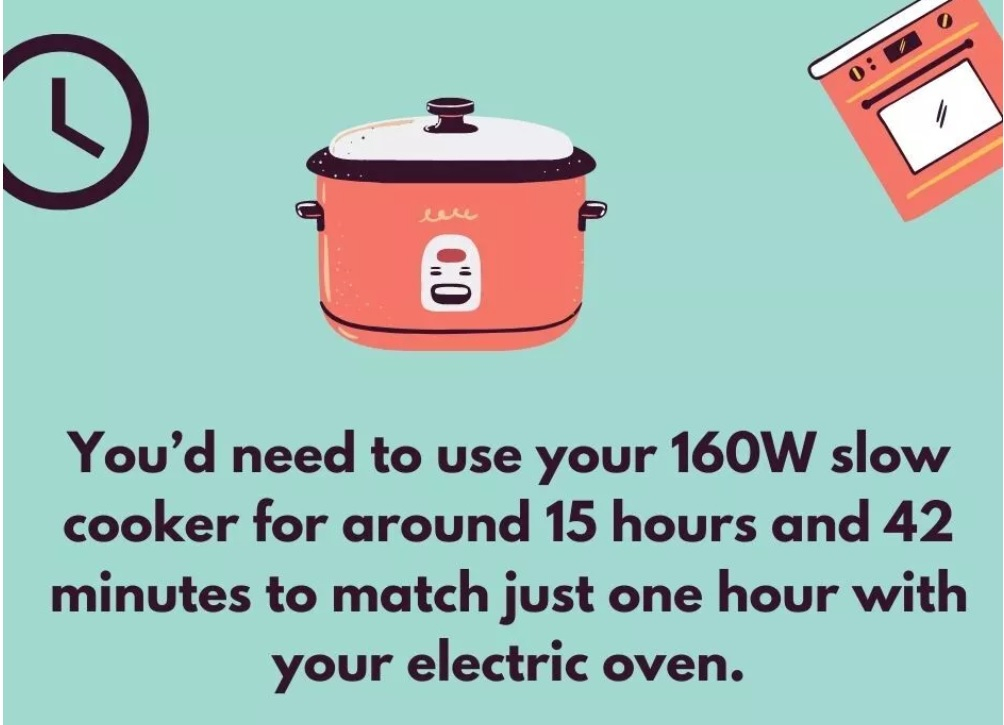 So are you suggesting that using a slow cooker is more inefficient than the electric oven? i.e. To cook say some brisket or some beef joint?I'm not suggesting that (although it might or might not be the case). I'm saying that the infographic is quite specific about how long you can run a slow cooker for, for the same amount of electricity as you'd use running your oven for an hour, and that it's unlikely to be correct for any given combination of appliances and settings.Even if it is correct, the infographic makes no claim about how much electricity it takes to cook a dish in either appliance (although I guess it's trying to imply that you'll use your slow cooker for less than 16 hrs to cook a dish that would take more than 1 hr in an oven).Exactly how much electricity it takes to cook an equivalent dish in a slow cooker vs. an oven (or vs. a pressure cooker on the stovetop) will depend on the appliances and would need to be measured. No, I'm not offering to do this!