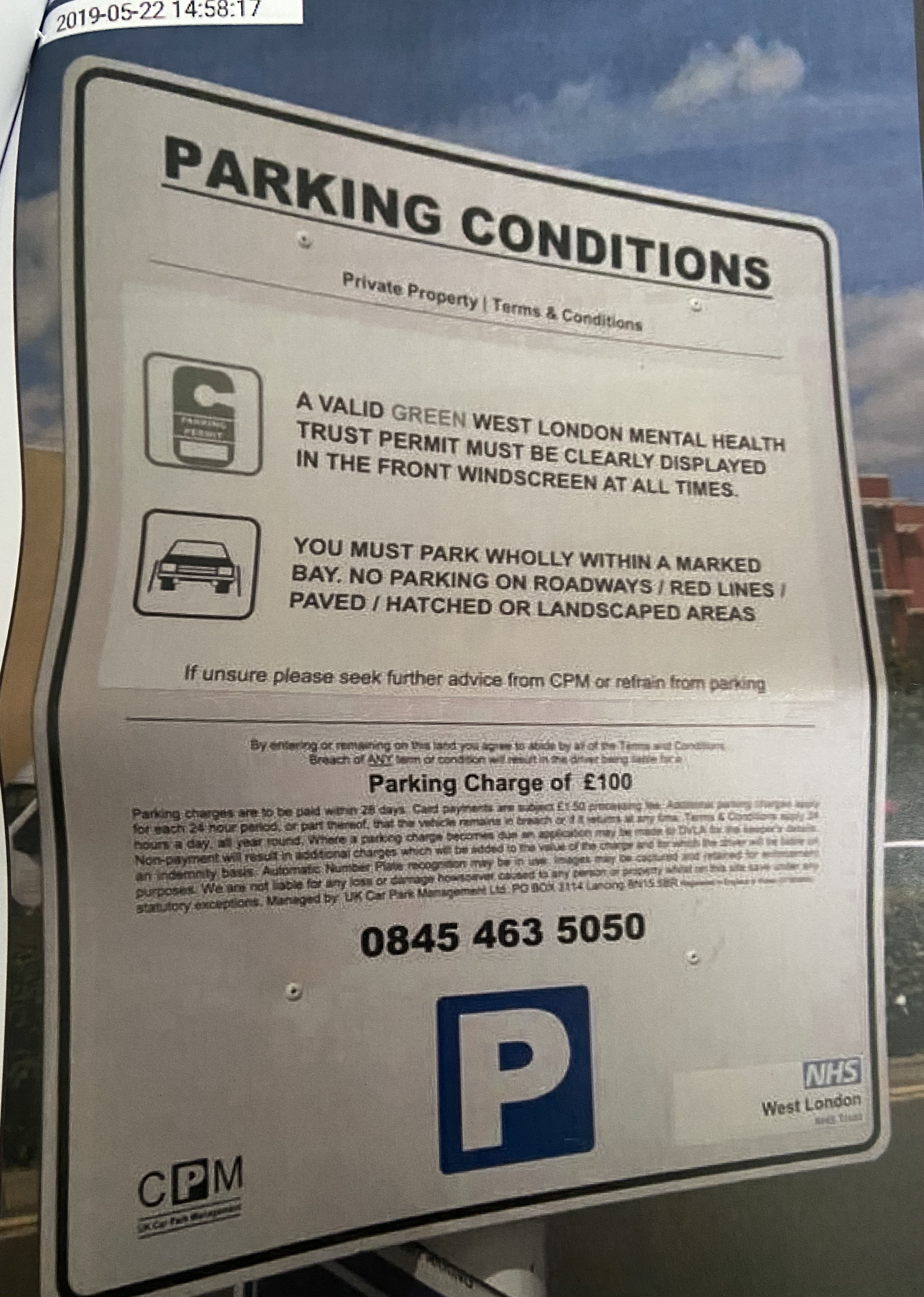 however in the new sign it states:“STAFF MUST DISPLAY A VALID GREEN WEST LONDON NHS TRUST PERMIT IN THE FRONT WINDSCREEN AT ALL TIMES.”0 -