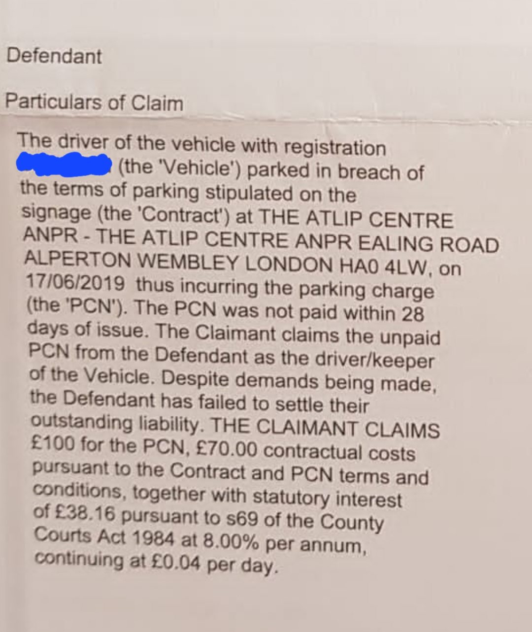PCN CC Claim from Gladstones & UKPCN in Atlip centre Wembley