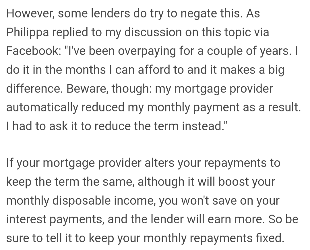 K_S said:@Ultrasonic If it's these two paras below that you're referring to, I would interpret that (in the context of the rest of the article) as saying that either ask the lender to keep the payment the same or increase the size of your regular overpayments to continue to pay the same amount.