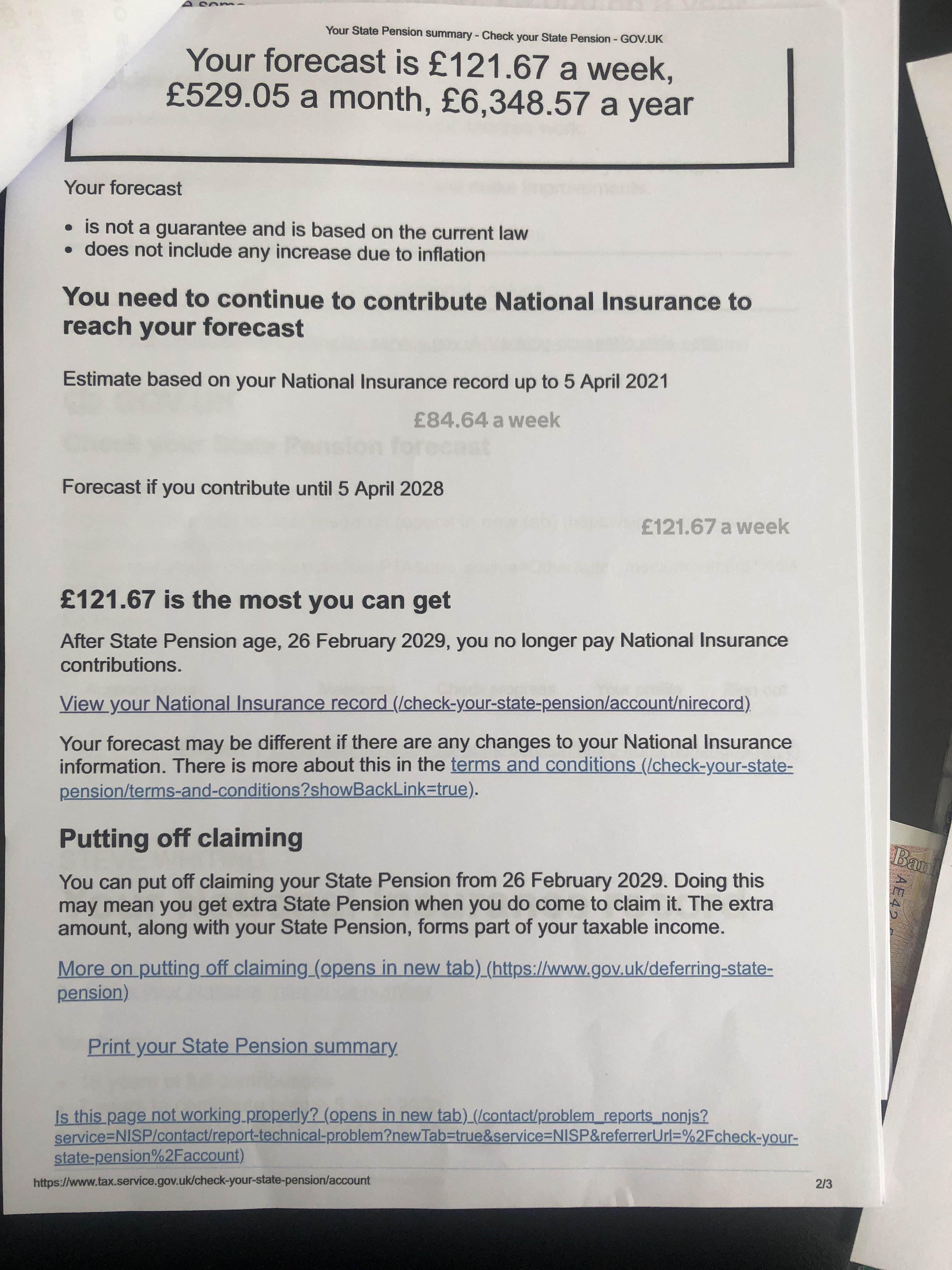 Check your state pension on: Check your State Pension forecast - GOV.UK