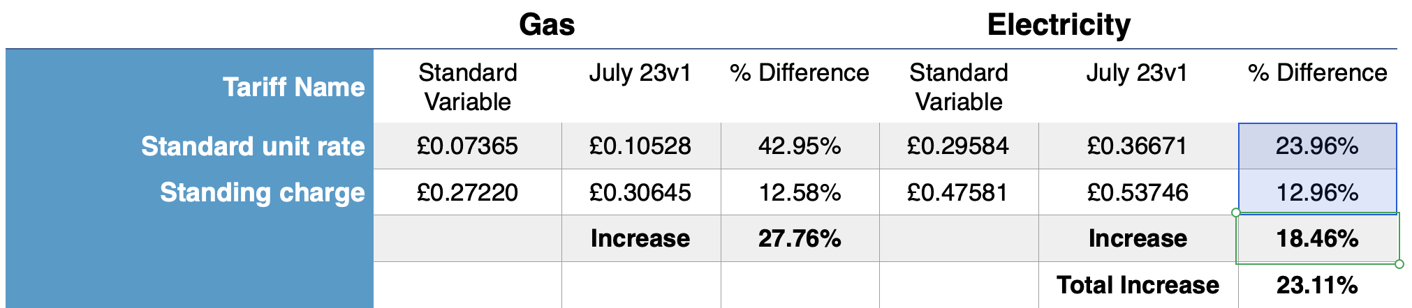 For example you have a 12% increase for gas standing charge and a 43% increase for gas and you see it at an average increase of 27.76%.