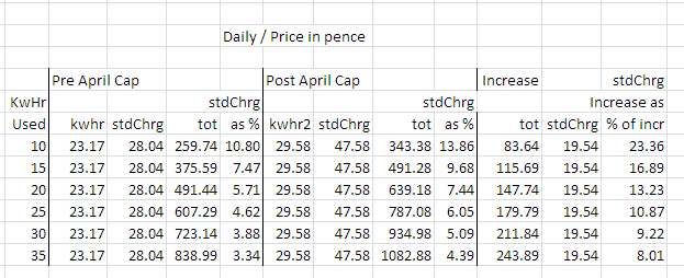 I just looked and I use 30% of my annual energy JUN-SEP and 70% during the other 8 months. On energy prices alone it'd cost me more to move at the available +35% than stay on variable unless the cap moves again between Oct and Apr but I cannot figure out if the move makes sense or not because I have no idea what the standing charges'll be. I'm on electricity only (no gas) and the standing charge went from 28.04p to 47.58 p last time while the KwHr went from 23.17 to 29.58 so depending on usage here's how standing charge fits in there: