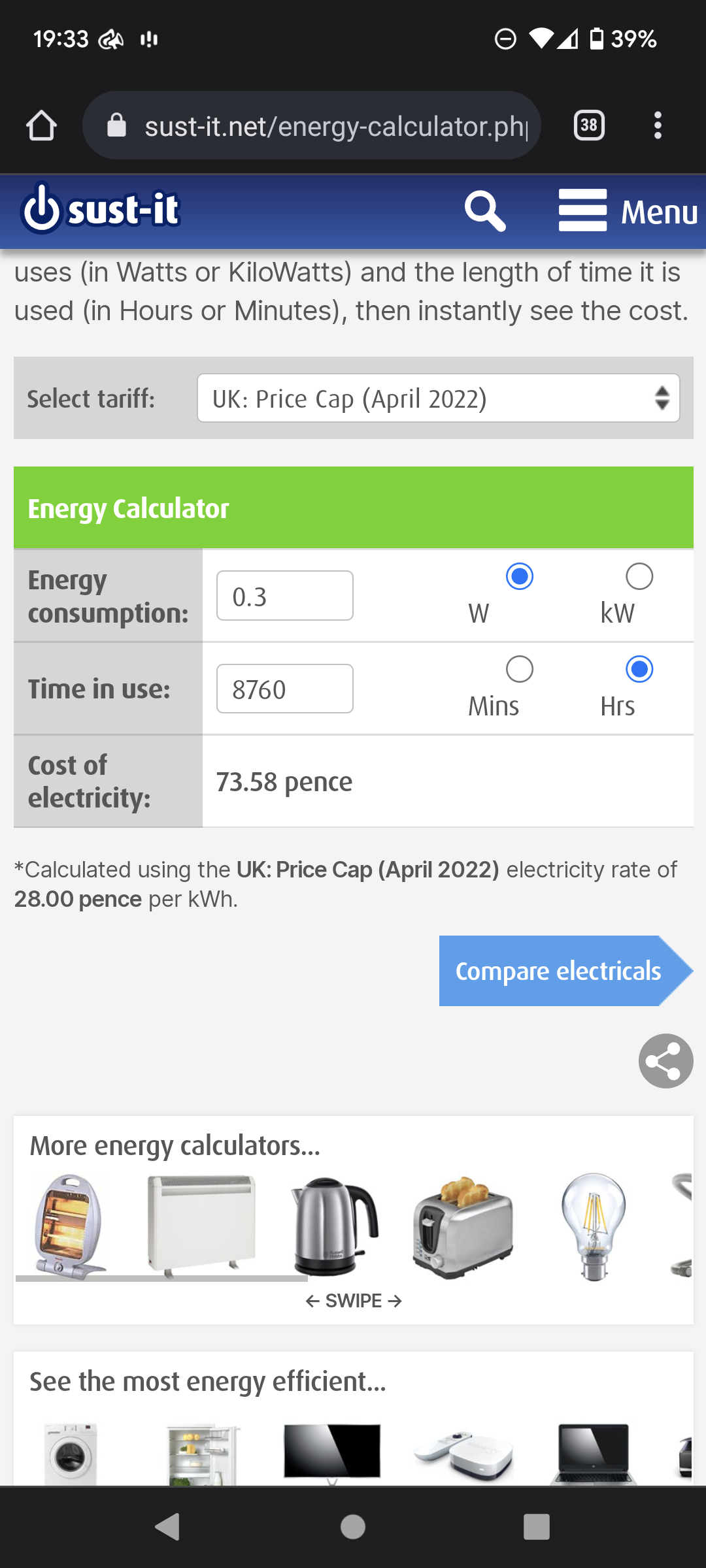 So the first website I used 0.3w and 8760hrs which works out per year?