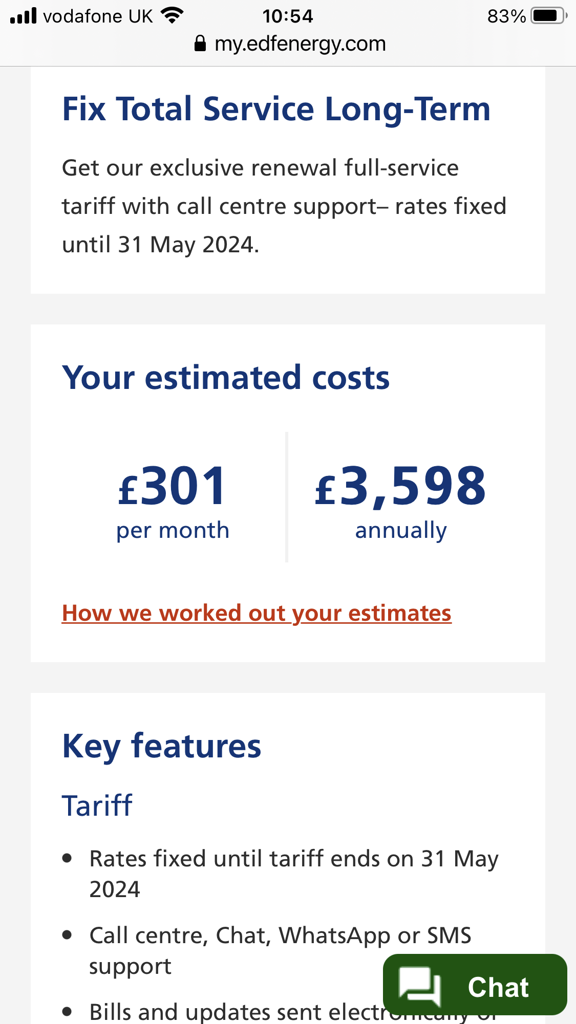 - EDF's 2-year fixed tariff, with gas under 10p/kWh and electricity under 34p/kWh, is cheaper than would be expected this winter if Ofgem's anticipated 40% rise happens (which would put gas around 11p/kWh and electricity around 40p/kWh).