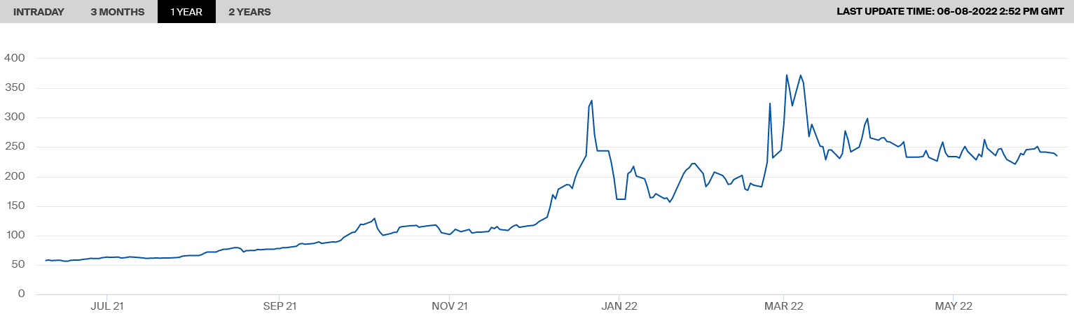 pensioner2 said:Just checked the UK gas futures price to find that it has been falling like a stone. Is it not possible to spread good news?If you are seeing it 'fall like a stone' you are probably looking at July contracts.Have a look at Q4 22, Q1 23 or Winter 22 contracts...This is Winter22 right now...