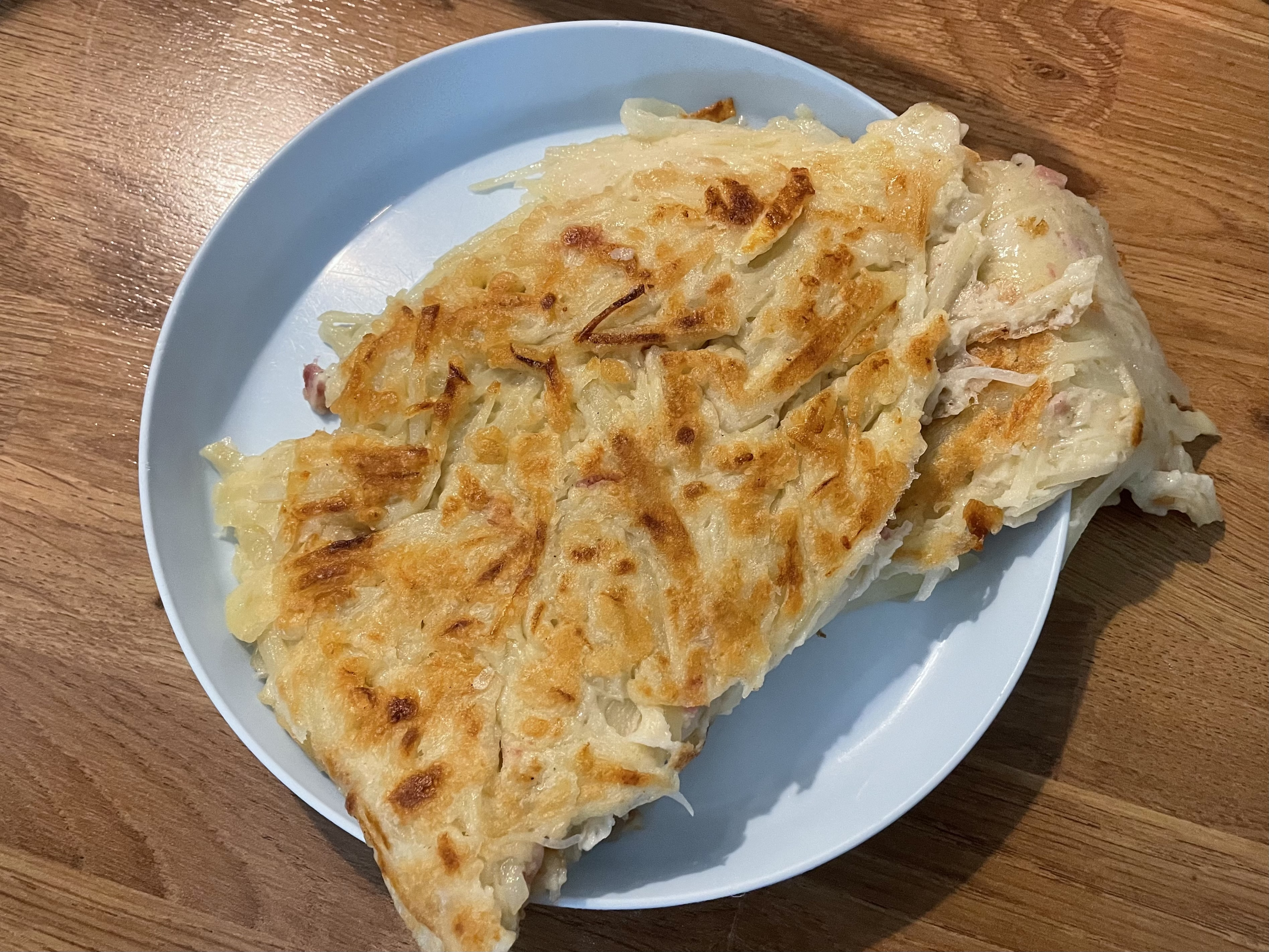 Potato pancakes (5 helpings)1. Two medium sized potatoes, peeled, washed, sliced, shredded finely.2. Cubed bacon/ Spam/ gammon/ ham (optional but recommended)3. Chopped spring onions (optional but recommended)4. Beat up three eggs, add in 70g plain flour, ingredients mentioned in Step 1-3, a pinch of salt and ground white pepper and some water. Stir them well.5. Heat a pan, add in oil (veg/ sunflower), add in some mixture, wait for one minute. Flip the sides until lightly browned on both sides.We usually have it at breakfast or bunch. Also can be served as a main with other dishes. It’s delicious and very filling. As you might tell from the photo, we ran out of spring onions this morning