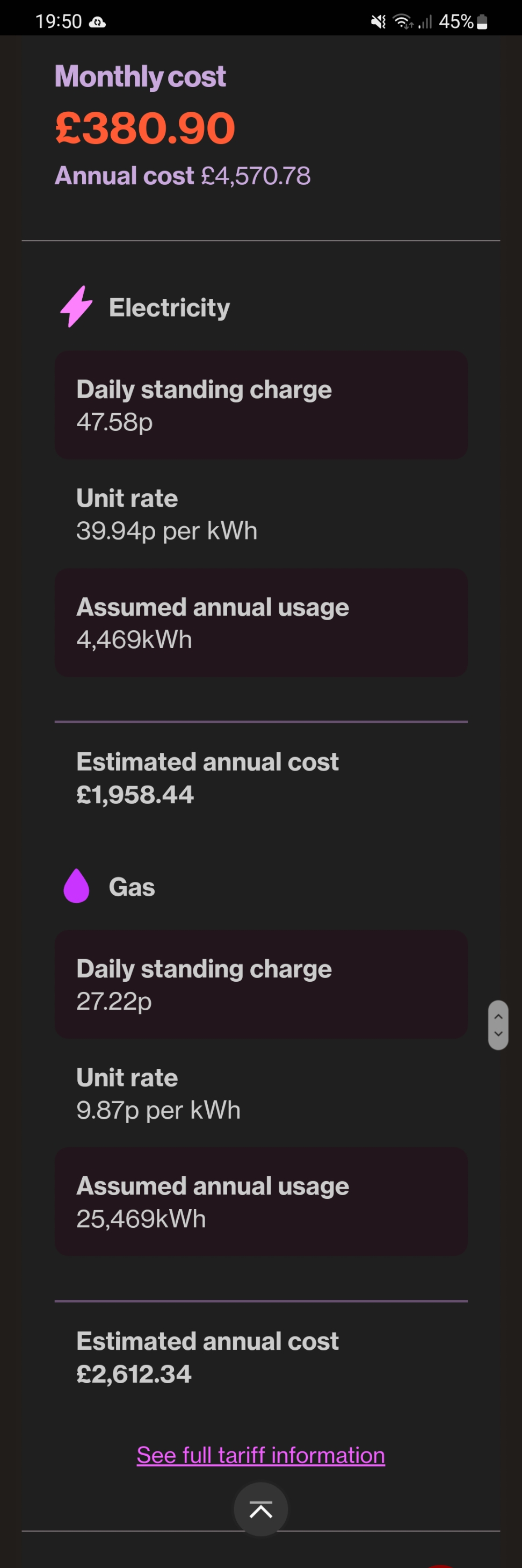 katharinespencer said:Our typical annual usage is 4051kwH for electric and 26208 kwH for gas. We live in a 4 bed property but only 3 of us.Ignoring any arrears on your account, on the current variable tariff that would cost around £3350/yr, £280/month.On the previous variable tariff it would be more like £2100/yr, £175/month.