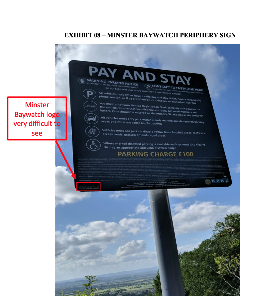 12. It is only when you explore the far peripheries of the car park where there are some smaller signs with illegible terms. It is on these signs you can barely make out a small dark logo ‘Minster Baywatch’ (Exhibit 08). Of note, the parking terms between the tariff payment signs and these smaller periphery signs are in fact different. The Minster Baywatch sign requires a ticket or an active Ringo payment. The Bransby Wilson one permits retrospective payments up to midnight. The wording of the contract and payment details are on the Bransby Wilson tariff sign. It is the payment that is the consideration for the contract terms and who the contract is with. The offer to park is by Bransby Wilson.