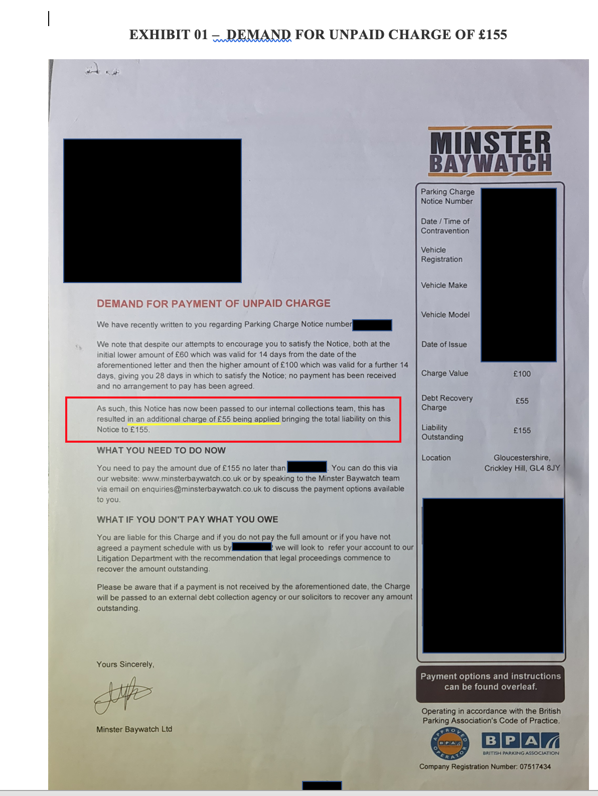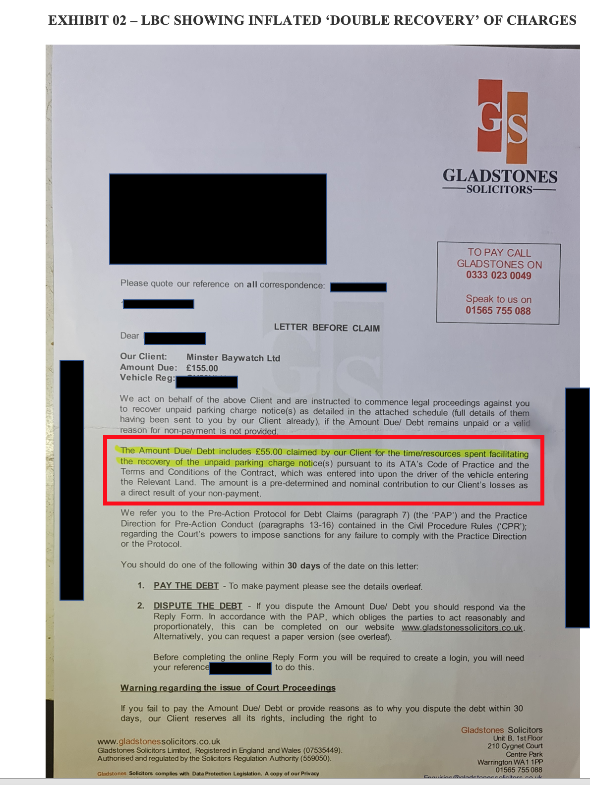6. When I first learned of this claim the Claimant had already issued court proceedings. The threatening tone of the letters were intimating a claim in excess of £270 which is seemingly ‘double recovery’ for costs of the Claimant’s debt recovery charges. I am still confused over the exact amount being claimed as the Claimant’s witness statement differs from that of the Letter Before Claim (LBC) and Penalty Charge Notice (PCN) (Exhibits 01 & 02), all three papers claim a different amount for ‘debt recovery costs’.