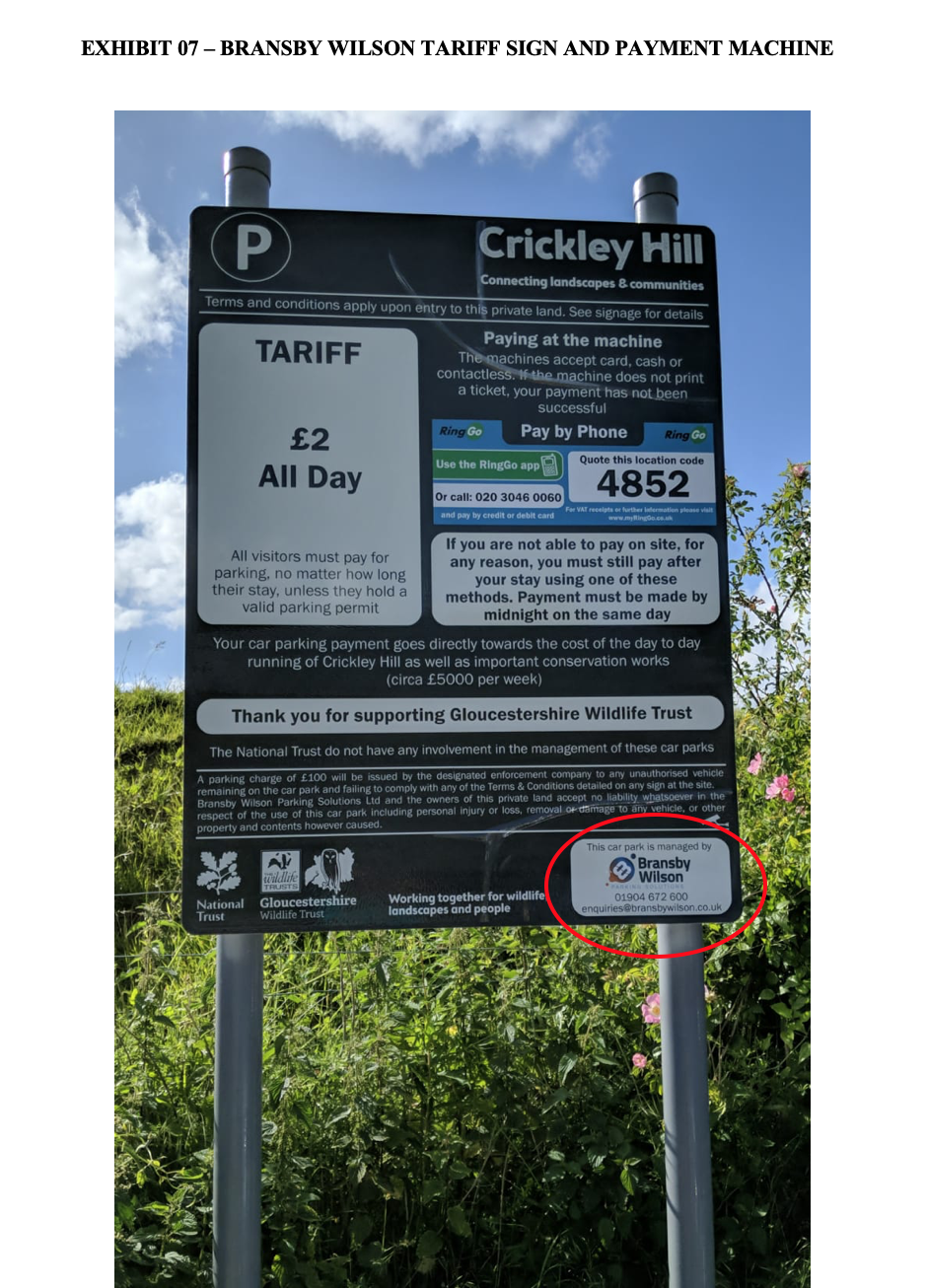 11. During the re-visit, I entered the carpark where I observed the Bransby Wilson tariff sign and payment machine (marked ‘BW Tariff Board 1’ at page 37 of the Claimant’s witness statement). Both the payment machine and tariff board clearly state ‘This car park is managed by Bransby Wilson’. There is no mention of Minster Baywatch (Exhibit 07).