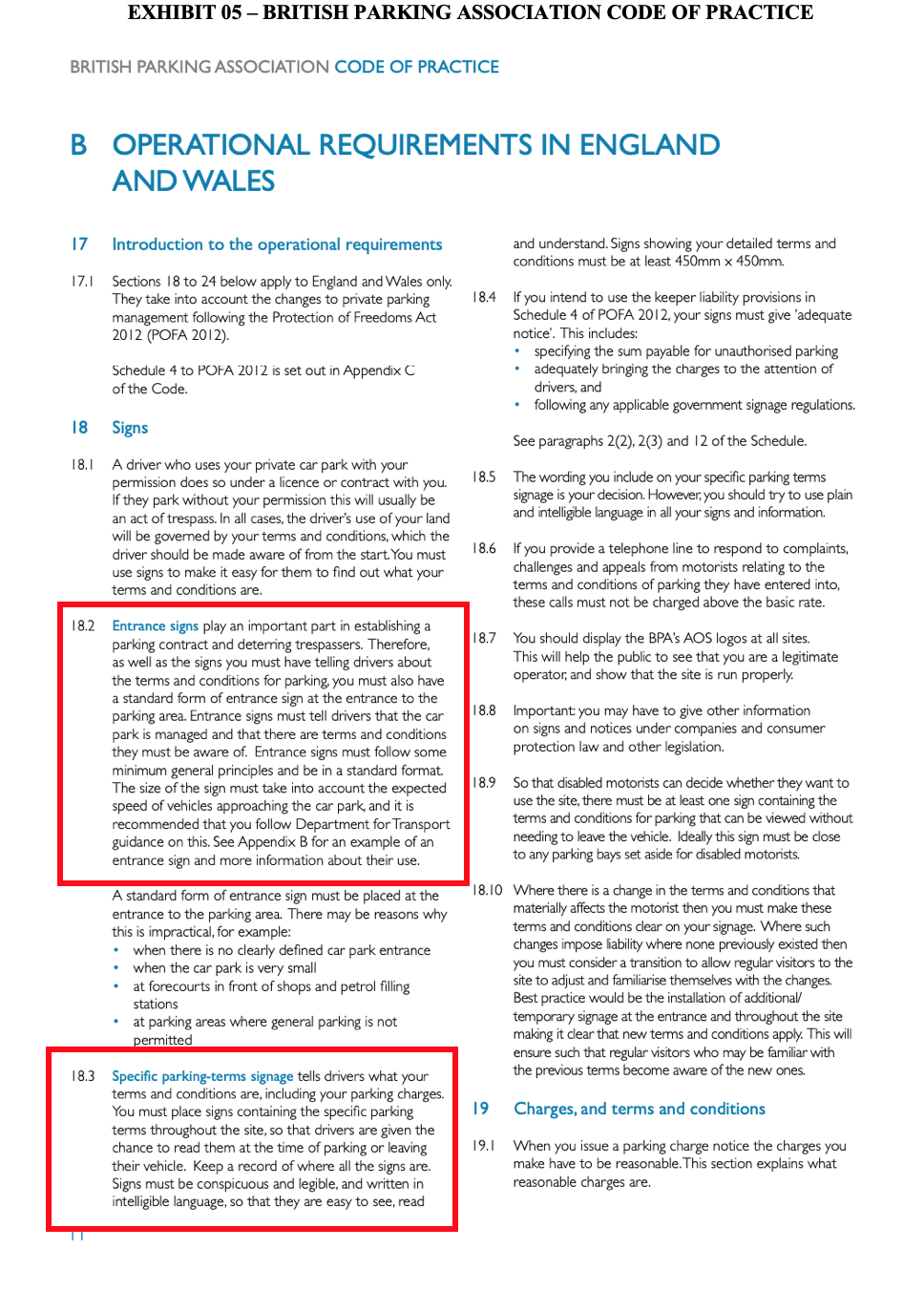 10. The claimant is a member of the British Parking Association, BPA (Exhibit 04). The BPA Code of Practice (Exhibit 05) states: