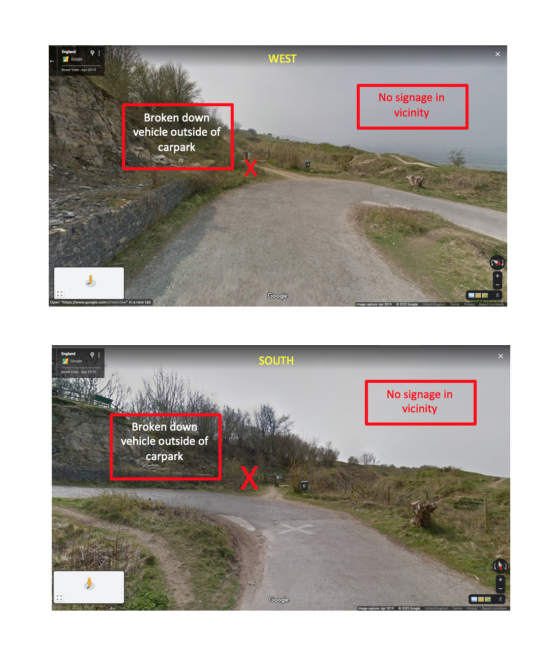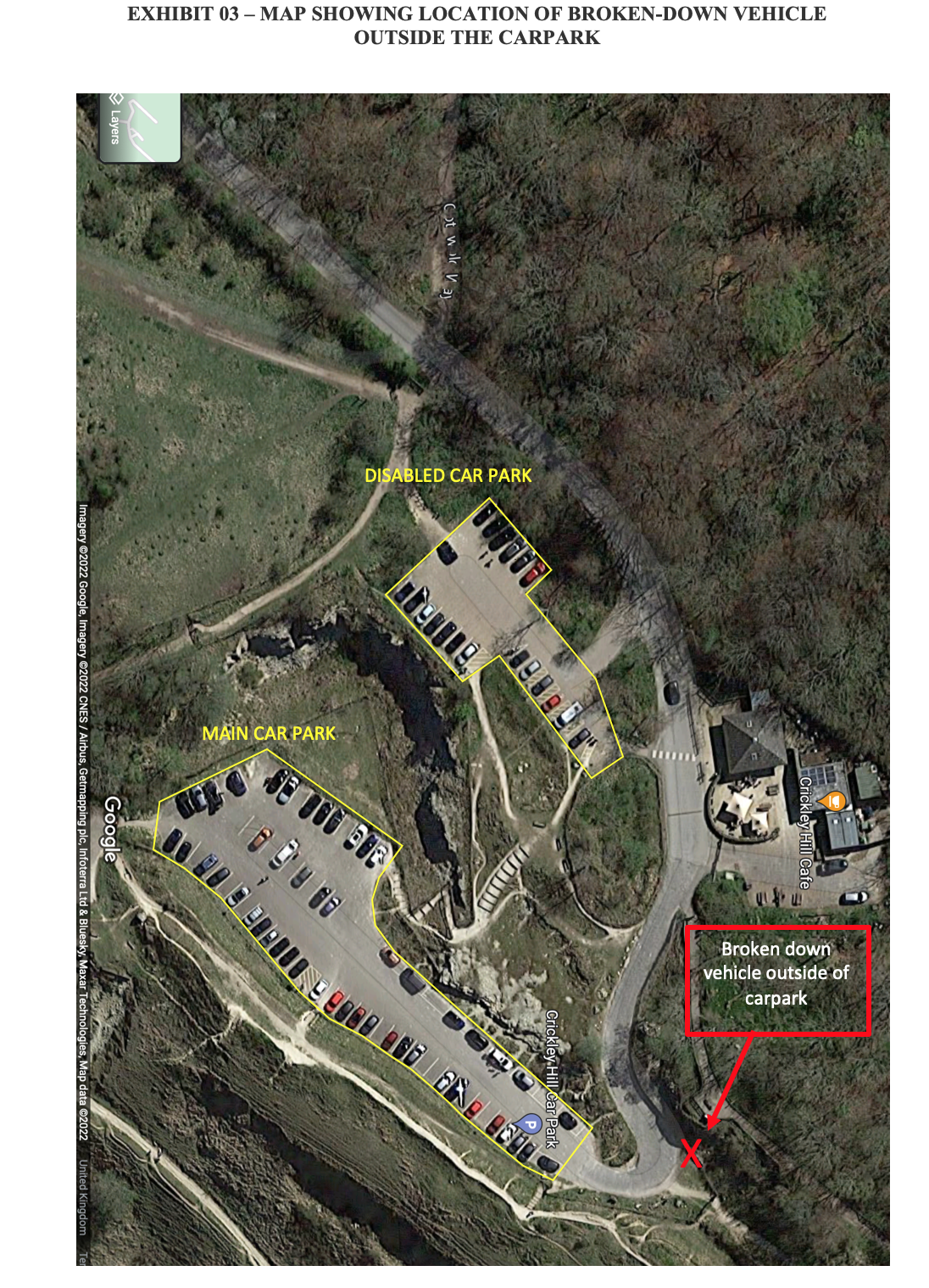 7. I am unfamiliar with the area and was passing through at the time. The vehicle alternator had failed and it was limped along the road looking for refuge, we pulled over at the side of the road well outside of the entrance to the car park (Exhibit 03). The bonnet was raised and the vehicle was not left unattended whilst a solution was sought.