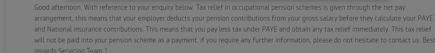 To be clear there is no pension tax relief with net pay contributions.