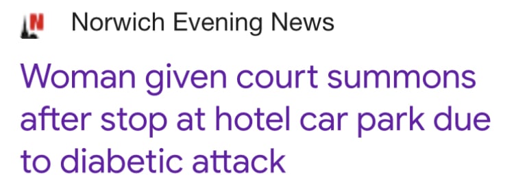 "Jessie Powell stopped for just 20 minutes after her Apple Watch alerted her to low blood sugar levels. Despite staying in the car park run by Euro Parking Services Ltd just long enough to eat a bag of sweets to bring her blood sugar levels up, she was handed a £60 fine."Of course it wasn't a fine but she seems to have got herself a CCJ, to boot: