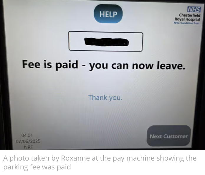 Roxanne described how on June 7 her husband drove her to A&E after she banged her head during a fall. She said: “We drove through the barrier and it said ‘fee paid’ even though we hadn’t actually paid.