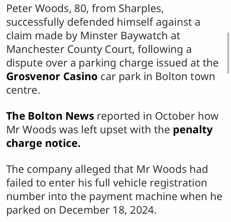 Pensioner Peter Woods wins court case against Minster Baywatch over disputed Bolton parking fine at Grosvenor CasinoMr Woods was able to demonstrate in court that he had paid the correct parking fee.