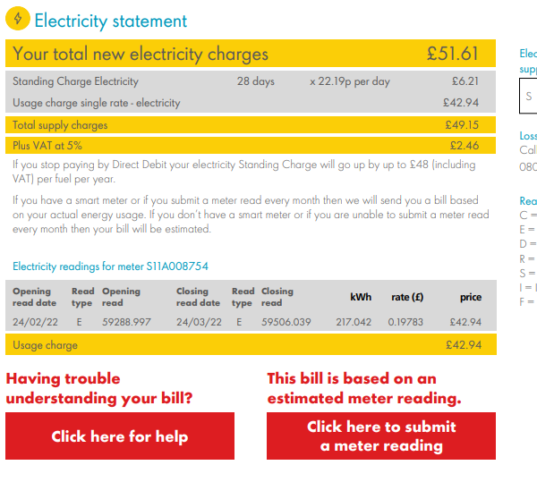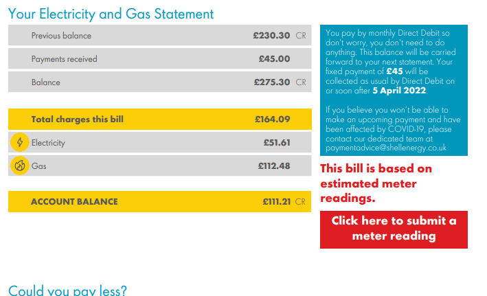 After the posted March bill your credit is down to £111.21. The whole bill is based on estimates, and you have used 1775KWh electricity more than estimated on 31/03/22 and 274 addition al units gas.