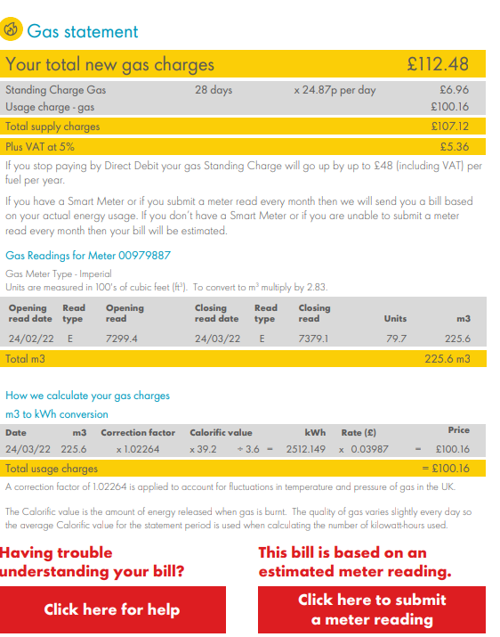 I only just realised your meter is cubic feet. So the conversion to m3 is missing. This adds another £220 to the gas cost up to end of March plus £185 from April to 16/06/22.