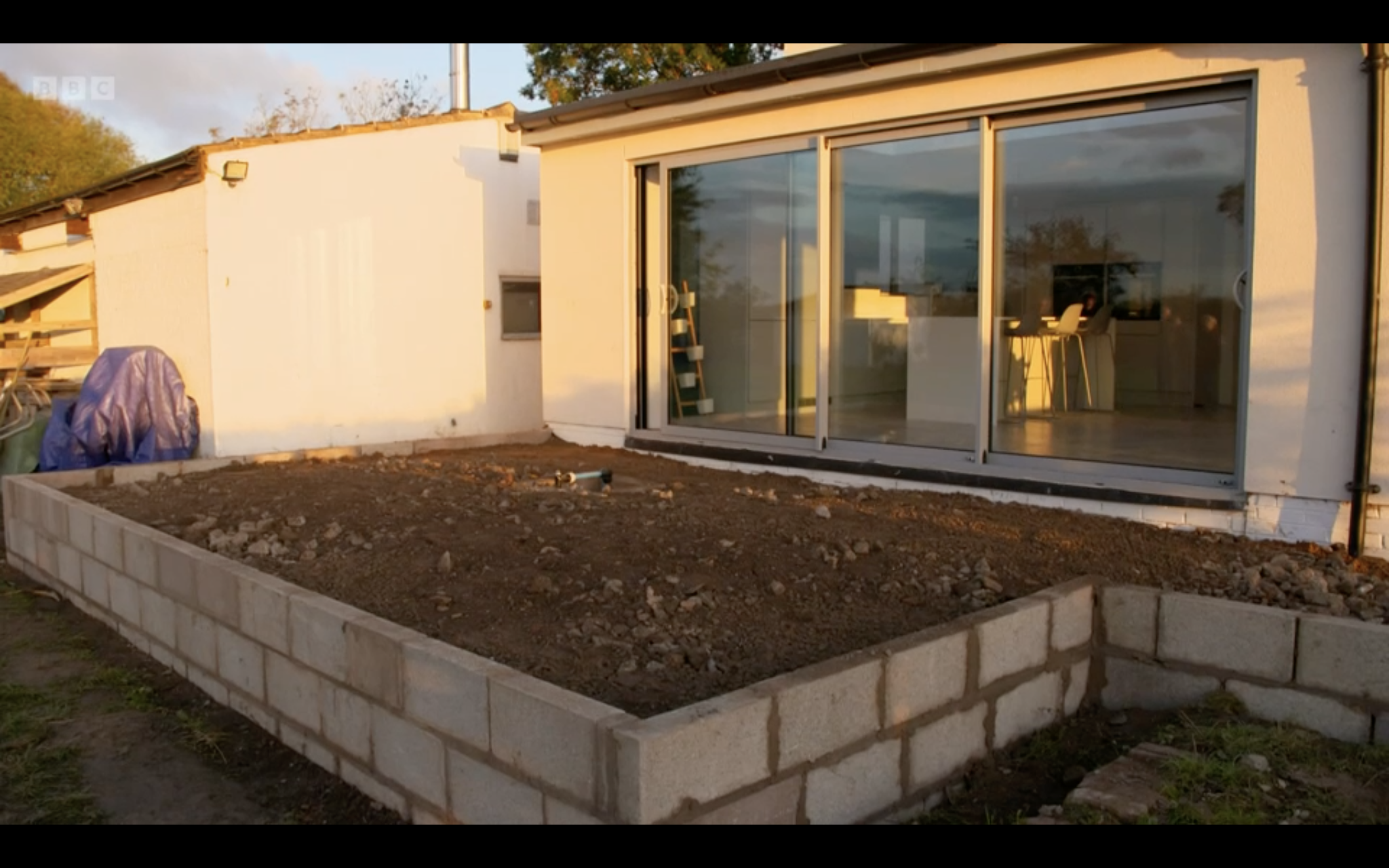 Our new bungalow is on a bit of a slope from left to right, so if I wanted to have a level patio at the back, at one side of the bungalow it would be level with the existing ground, and then would have to be gradually raised as it extends to the other side of the bungalow.