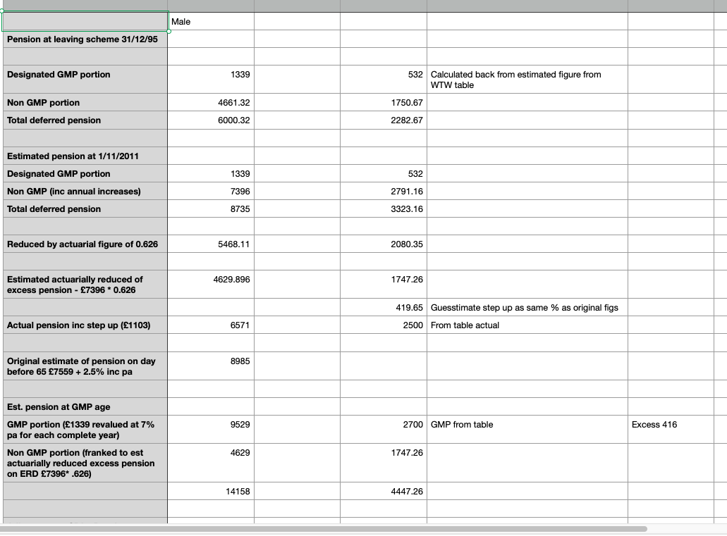 Ok, having looked a little more closely at the instructions for calculating starting GMP, it looks simple but not easy, as much of the basic figures needed would be pretty hard to collect, eg. Do you still have a record of the contracted out NICs you paid in the 1970’s? Etc...MikeFloutier said:Then, simply apply the same formula to Her in order to check the Her portion of WTW’s chart.