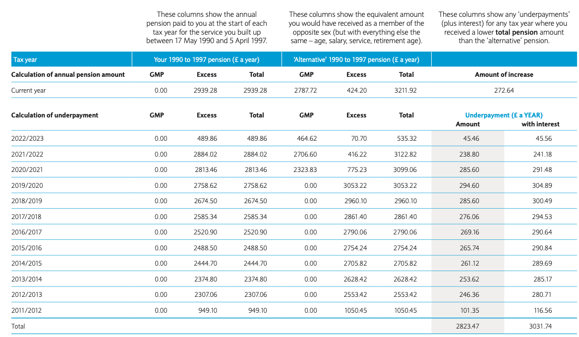 Ok, firstly I feel it would be helpful to clarify some basic info, so (and please correct me...):1. You were born in mid 1960,2. Left COE with Barclays on 31/12/1995,3. Accepted offer of ERD pension on 1/11/2011,4. Will reach GMP age mid 2025.5. Current pension, in payment, includes actuarially reduced GMP, plus a figure of £1103 reflecting your anticipated GMP step-up,6. Your Barber Window is 17/5/1990 - 31/12/95.Anyway, suffice it to say you have agreed that your current pension is correct, and that the estimated step-up at GMP age is correct.——Moving on to the new issue of GMP equalisation, I think we all agreed the methodology used in the WTW chart, and it’s just a matter of checking the numbers.You mentioned that you’d been able to verify your portion of the chart’s figures but couldn’t do so for the Alternate portion (Her) since you didn’t have Her starting GMP figure.I would suggest using the methodology contained in https://www.gov.uk/guidance/how-to-calculate-your-scheme-members-guaranteed-minimum-pension , firstly to verify your own starting GMP and to rehearse the actual calculations.Then, simply apply the same formula to Her in order to check the Her portion of WTW’s chart.Hopefully that helps.1