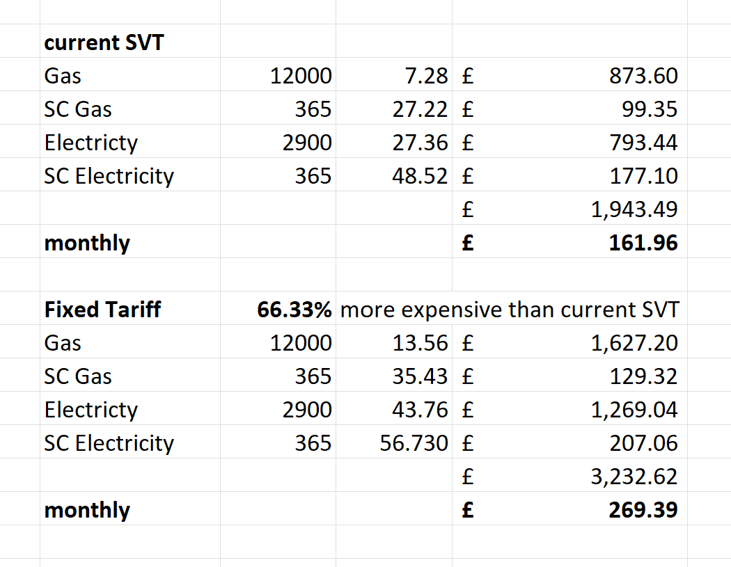 12.47p for gas and 41.88p for electricity, stick with the standing charges. That does not cater for regional differences in the rate and of course is a guestimate, but it should help you to make a better decision.1 -