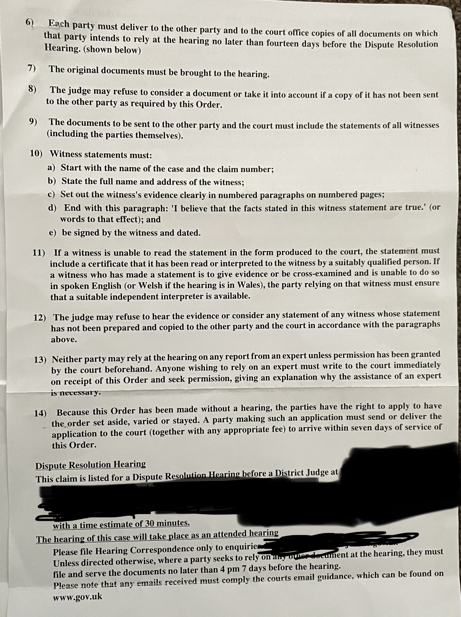 Don't forget that a 30 minute Dispute Resolution Hearing is discussed on other threads and you will learn this IS NOT likely to be your final hearing. It is glorified Mediation = pressure on you to settle.