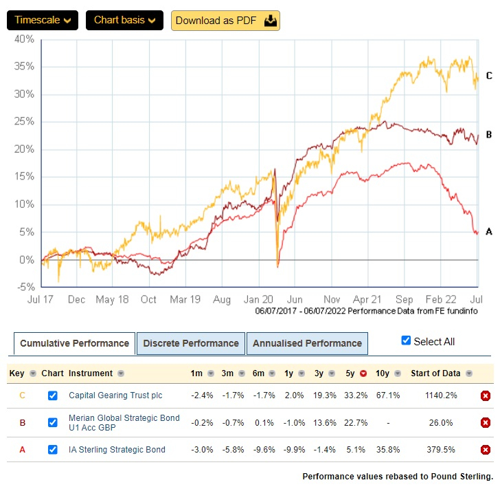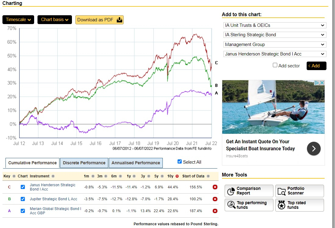 Clearly and simply Merian is a much more cautious fund. Over the first 7 years it managed to produce a 0% return, well below its competitors. So no evidence of unusually clever management unless you believe that in 2012 the manager foresaw what would happen 10 years later. Just as with equity funds you can choose your strategic bond fund on its risk level.