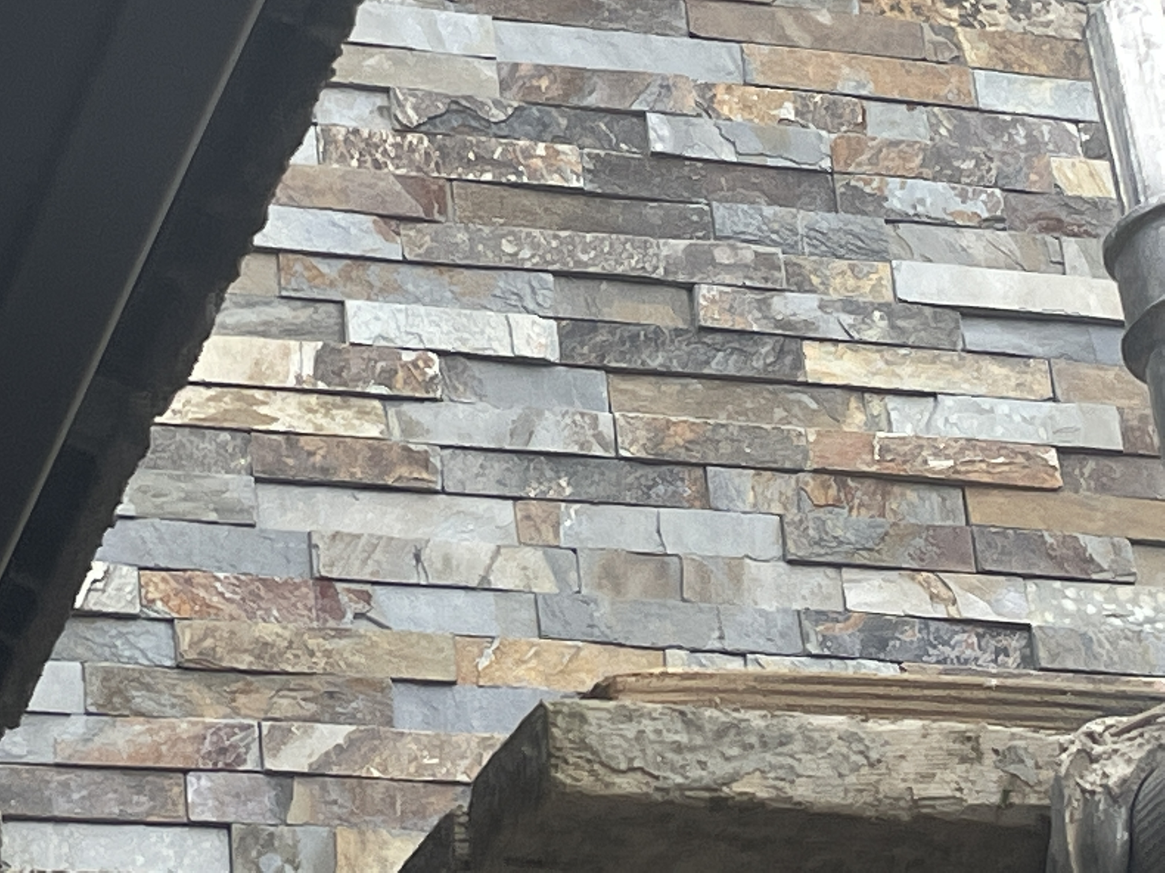 On the notes on the plans we made reference to the brand of split faced slate mosaic tiles we planned to use, 'or similar'. These are replacing the green hung concrete tiles on the front elevation. We've gone with a very similar tile as the reviews on the original choice weren't good. Unless I pointed it out that we've used a different manufacturers tiles, it wouldn't be noticed, particularly as they are mixed slate where the colours will naturally vary. We would have got the permission if we'd applied with our final choice I'm sure. Our planning note also said that the lower walls would be rendered in a 'complimentary colour' to the mosaics.