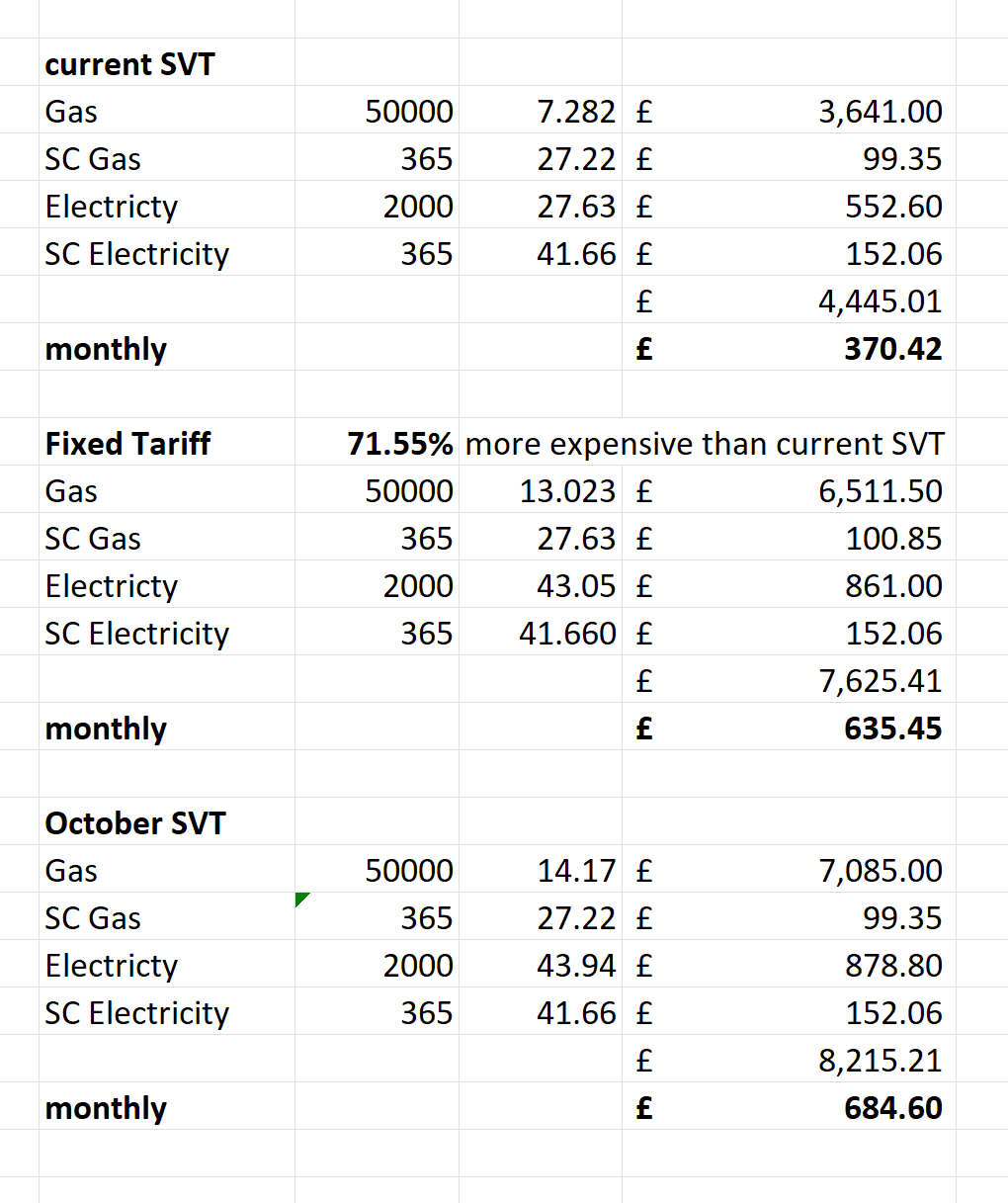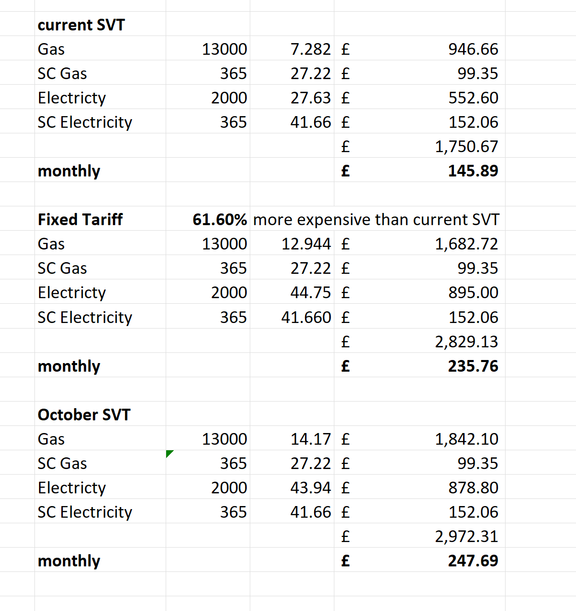 @pochase, I know you're being kind to spend time doing these calculations so I don't want to ctiticise them but are they not too simplistic? Should the comparison not be 12 months of the fixed price versus 2.5 months of current SVT + 9.5 months of Oct SVT? rather than a simple 12 months v 12 months?