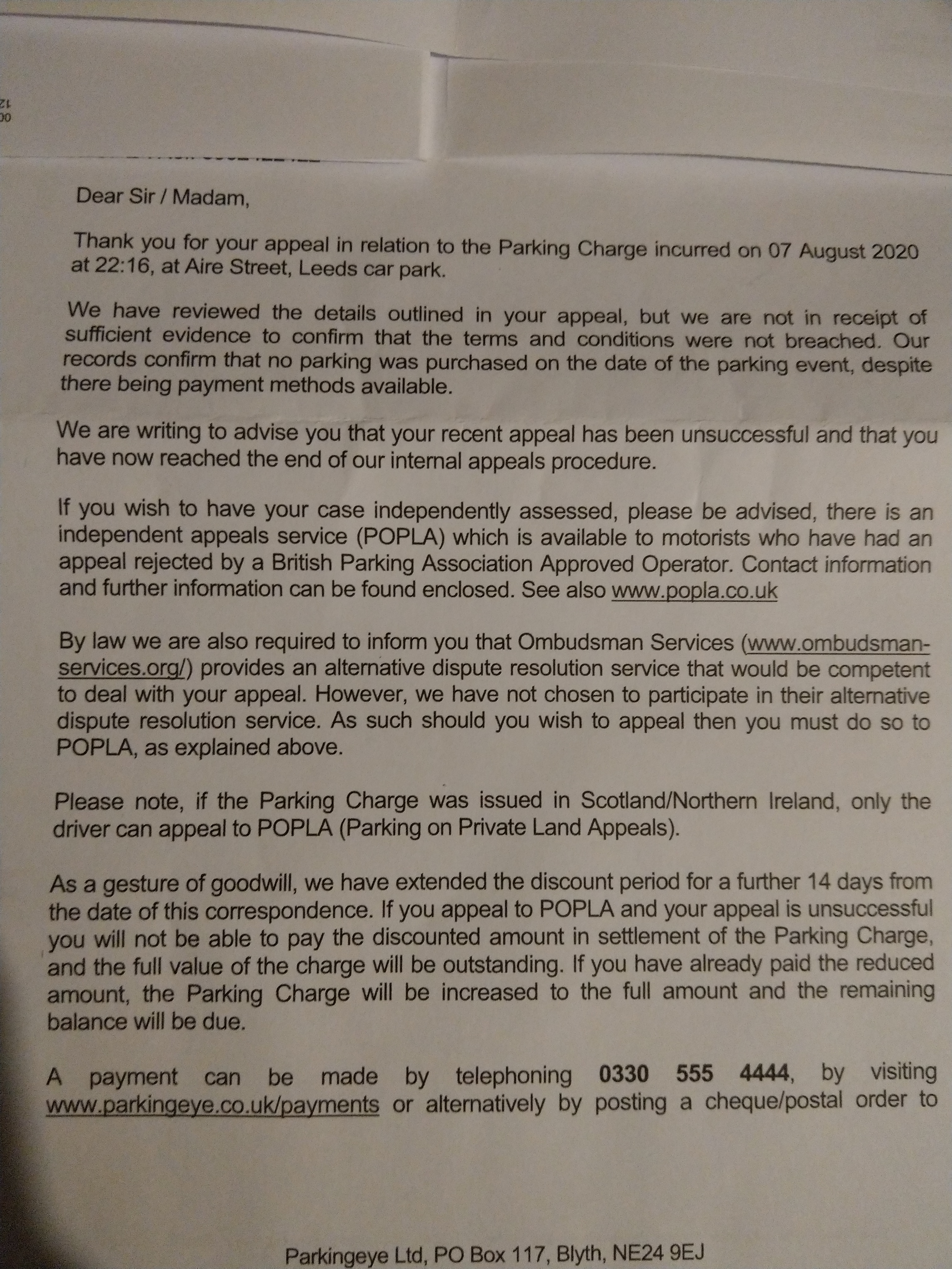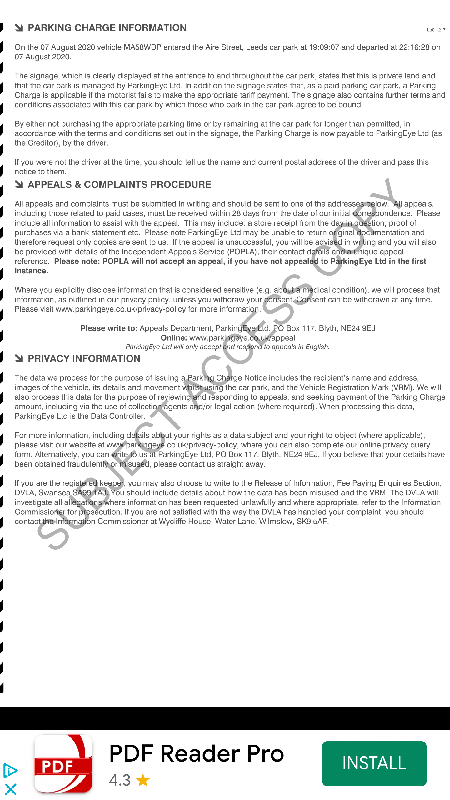 Hi mate sorry for the late response. No nothing like that on the back, I've attached that so you can see. Sorry it's small it's just a screen shot on my phone.Umkomaas said:I see that you've received copies of previous correspondence from PE via your Subject Access Request. Could you look at the very first letter they sent you - 'Notice to Keeper' - does it have a paragraph on the reverse side headed 'Protection of Freedoms Act 2012'? Could be important for your POPLA appeal.0 -