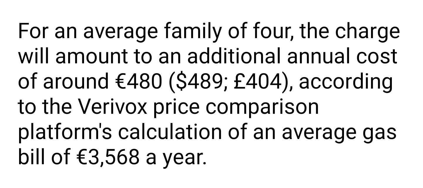"For an average family of four, the charge will amount to an additional annual cost of around €480"That's a bit of a selective quote.Trading Hub Europe, the German gas market operator, said it had set the levy at 2.419 cents per kilowatt hour (kWH).