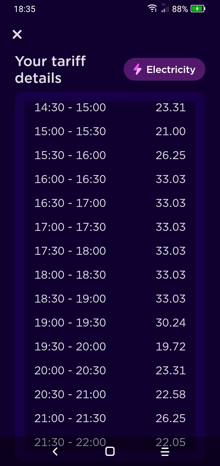 Interesting to see that Octopus prediction for tomorrow's rates - so thanks - but it's only half the picture; even better to see their full 24 hour tariff details.As you'll probably be aware, off-peak hours tend to be in quieter periods, when power demand is at its lowest, generally (but not always) between approximately 23:00 to 07:00.If you're on a time-of-use tariff - which (obviously) indicates the amount you pay is dependent on the time of day you use electricity AND you only use electricity in off-peak hours, which in this case is between 01:30 and 05:30 - then great.The update illustrated looks to have a steep increase between 05:00 and 06:00 onwards.So, in order to get a complete picture, do you have their rate predictions for peak-time users, i.e. the majority of households, from 06:00 to 23:00?