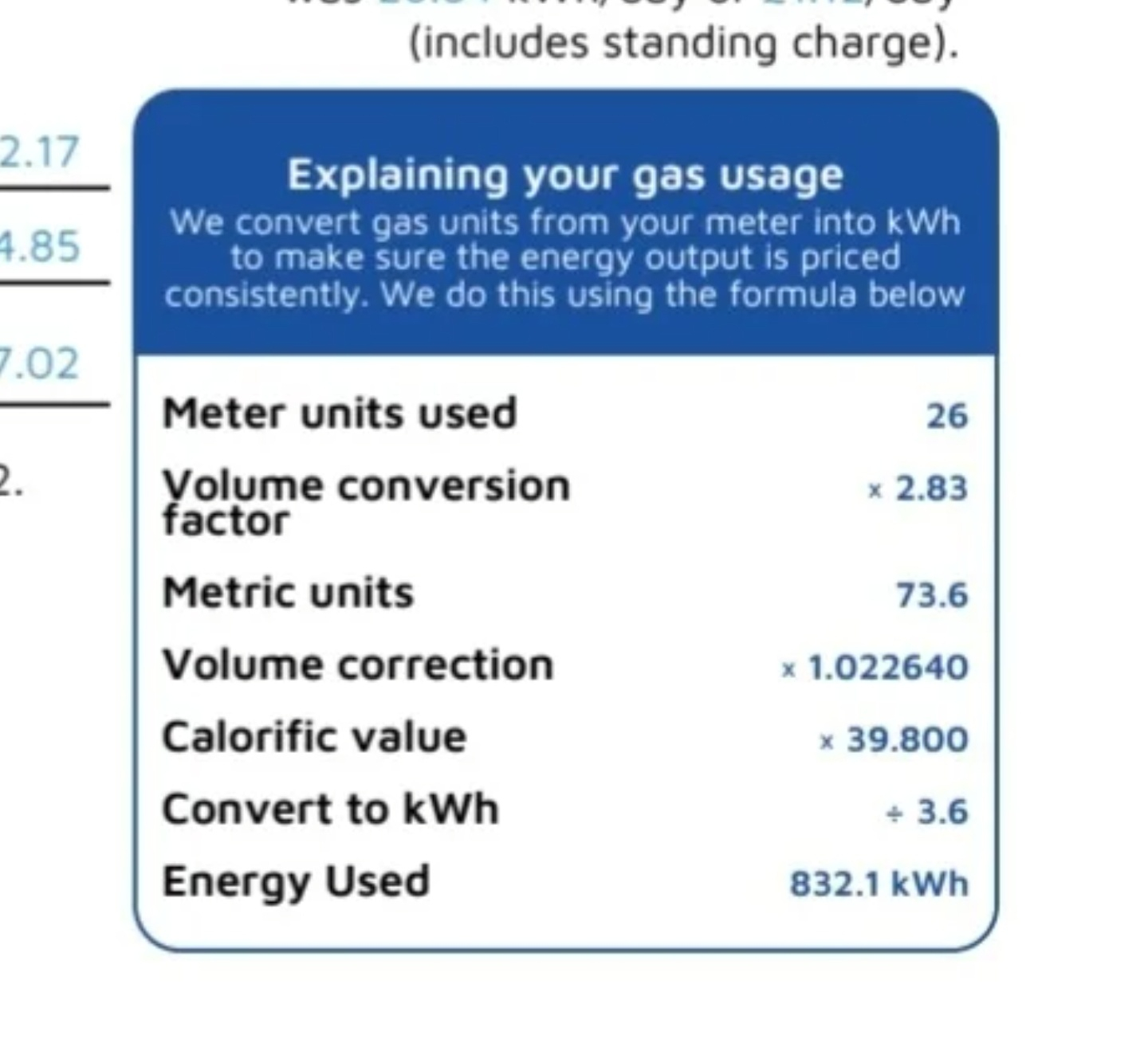 Does this help. Also worth noting I'm currently £410 in credit and expect that to be well over £500 by end of contract this month.victor2 said:So it is an imperial meter. Quite old and I would have thought about due for replacement, but that's another issue, unless it's faulty of course.The bill above looks a bit odd. It says 31 days standing charge, but there's only 26 days between the readings. Other than that, the calculation of the kWh looks OK. You have used 32kWh of gas per day in that period. Seems a bit high, but I assume that is mainly hot water for showers or baths.You could check how much gas a shower or bath uses by taking meter readings before and after. Multiply the difference in the readings by 32 and you'll get a very close conversion to kWh.It is impossible to comment on the supplier's estimate of your annual usage unless you have actual readings close to a year apart.Edit: If you do take meter readings for something like a shower, you'll need to record the fractions (red digits and possibly even the dial) to get a more accurate result.