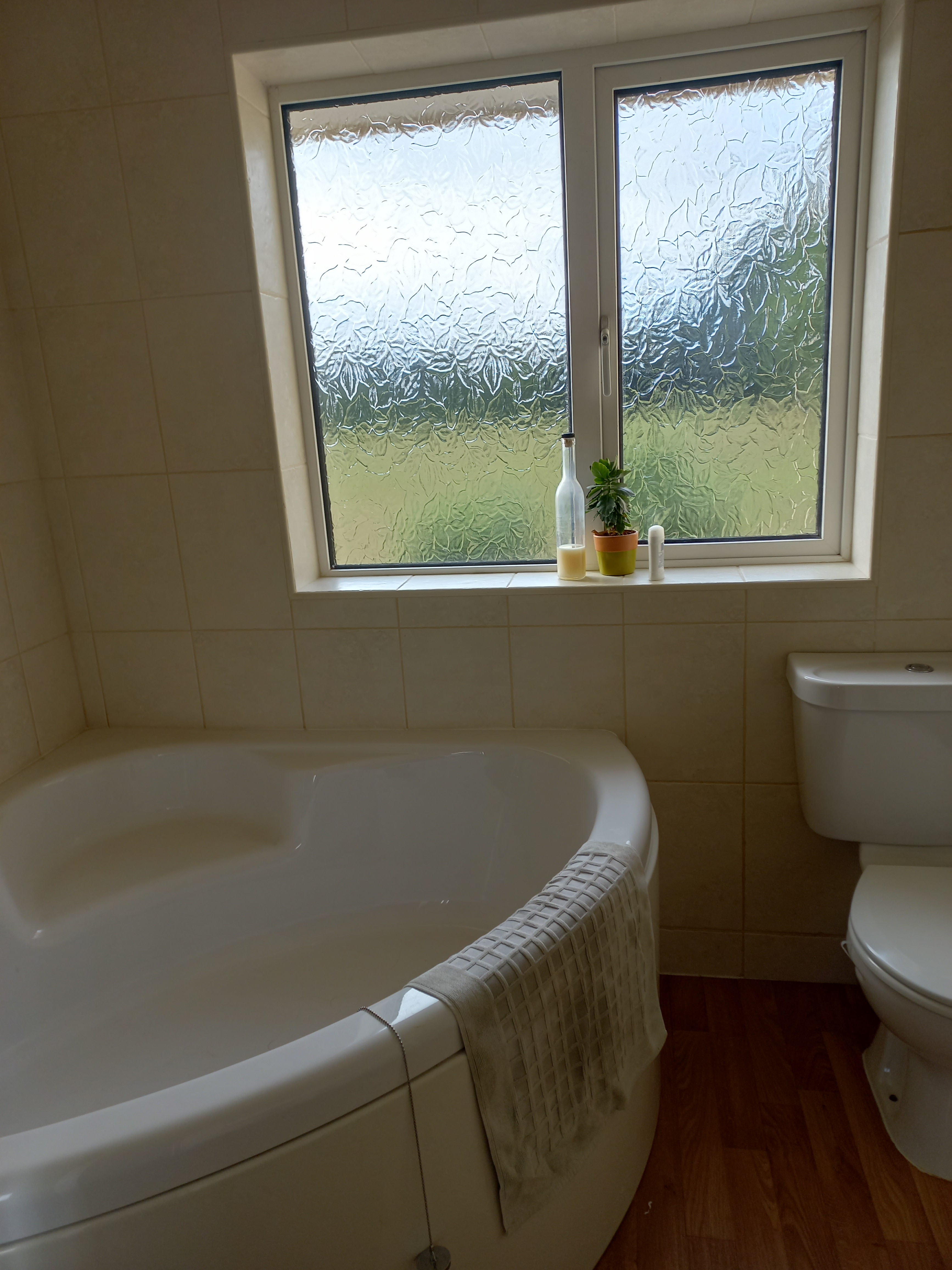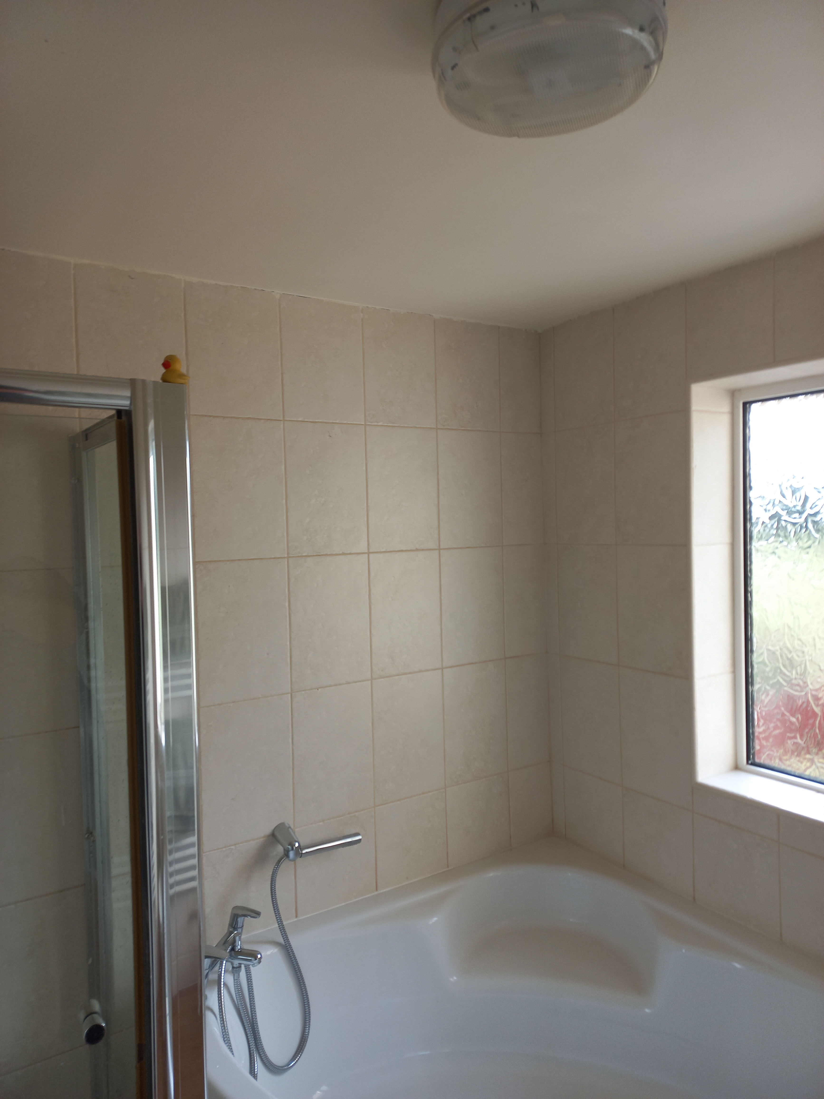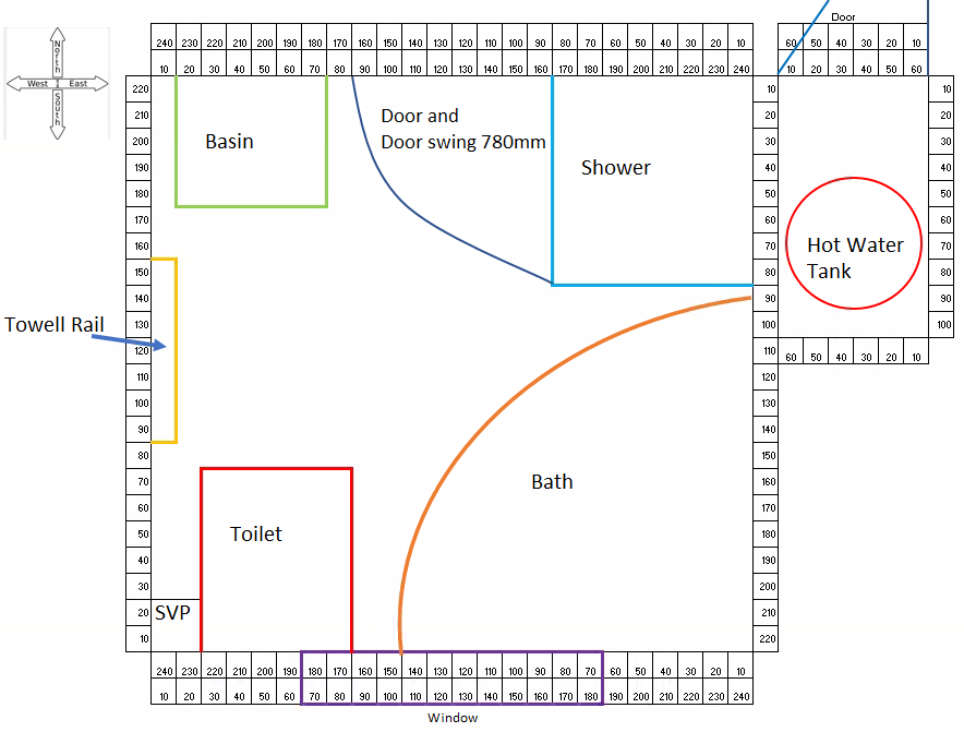 I appreciate the bathroom is not that big, I have drawn it to more or less scale here, each square represents 100mm x 100mm, so you can see the room is about 2400mm wide by about 2200mm deep. I also include some photos to give context.