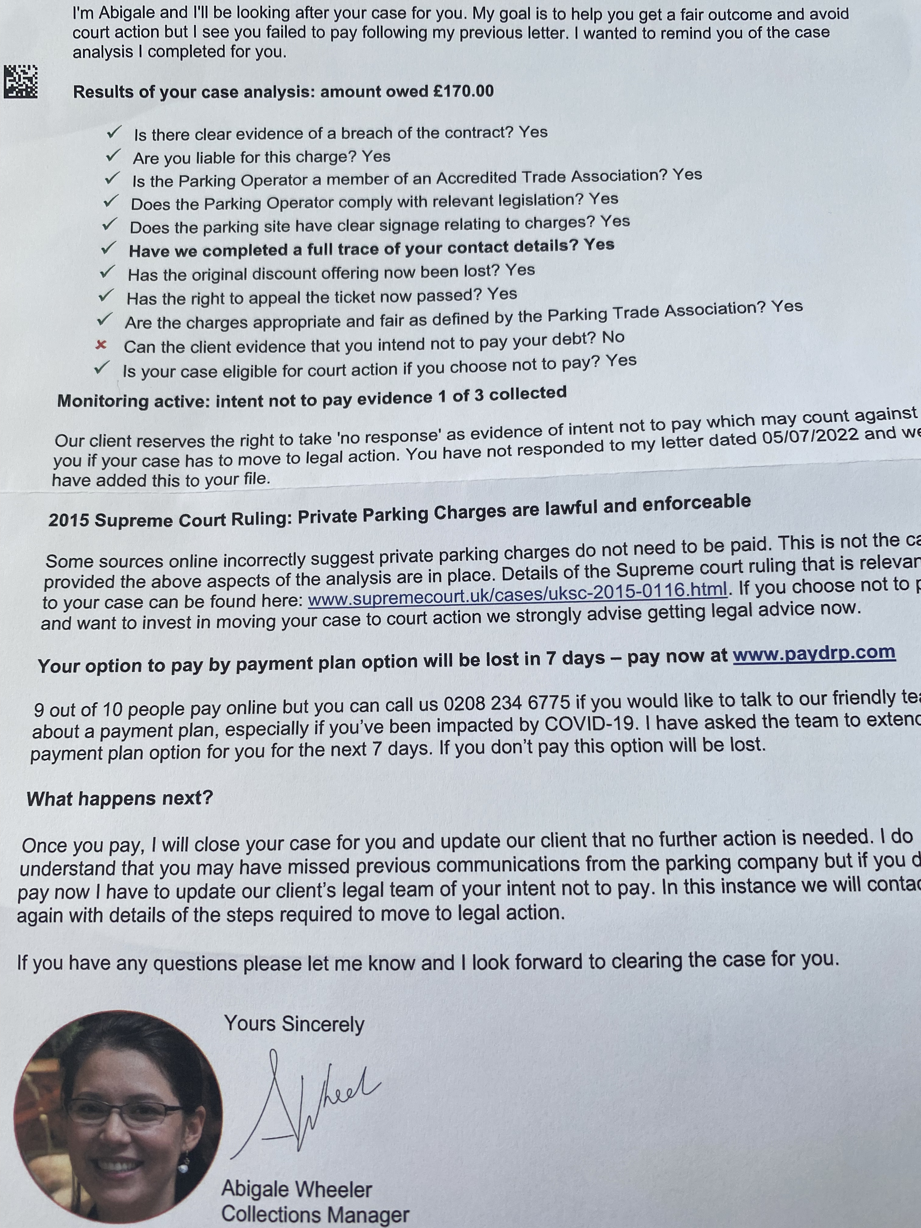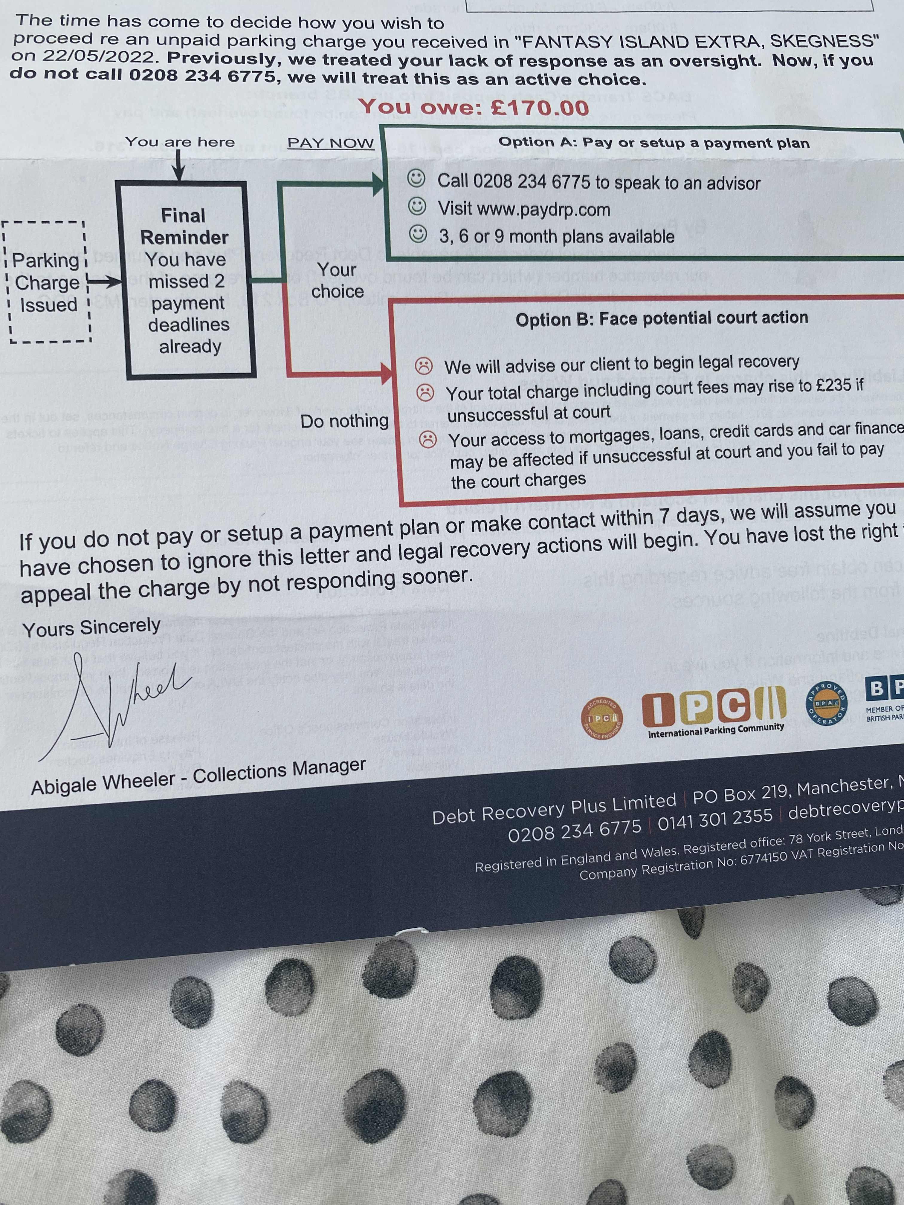 I got into contact t with Fantasy Island who have agreed to cancel the parking fine (no idea why the change of heart)