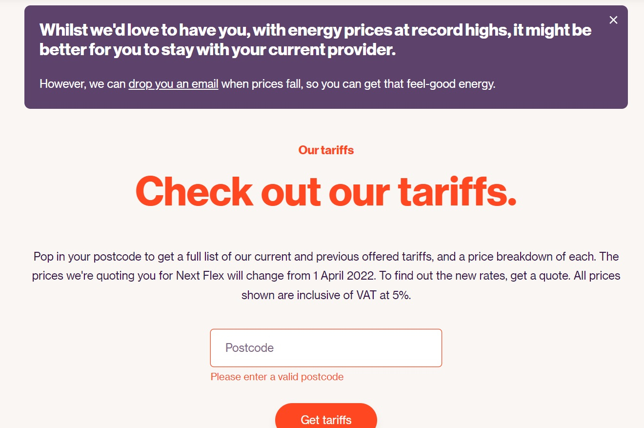 Login to your account and select Energy, Out tariffs from the menu. Scroll down to the bottom, where you will see Check out our range of tariffs, enter your postcode and they'll show what is available. To actually switch (and probably pay more than you are now), you'd probably have to phone or email them, as they don't appear to be offering tariffs to new customers or renewing fixes before they are due at the moment."When I try for a quote there's just a message advising not to change."Did you see that sentence?Possibly because their current tariffs are more expensive than that I am on, but they should be made available to see?They are not even discoverable from their website, without logging in, as a potential new customer, and using both my postcode and my daughter's!I receive exactly the same as others have posted.Therefore, what you posted doesn't work, Mr Ambassador.Thanks for posting the tariff though, which for some of us is obviously impossible to findSeeing that makes me glad it can't be found, I'll stay with the present one!1 -
