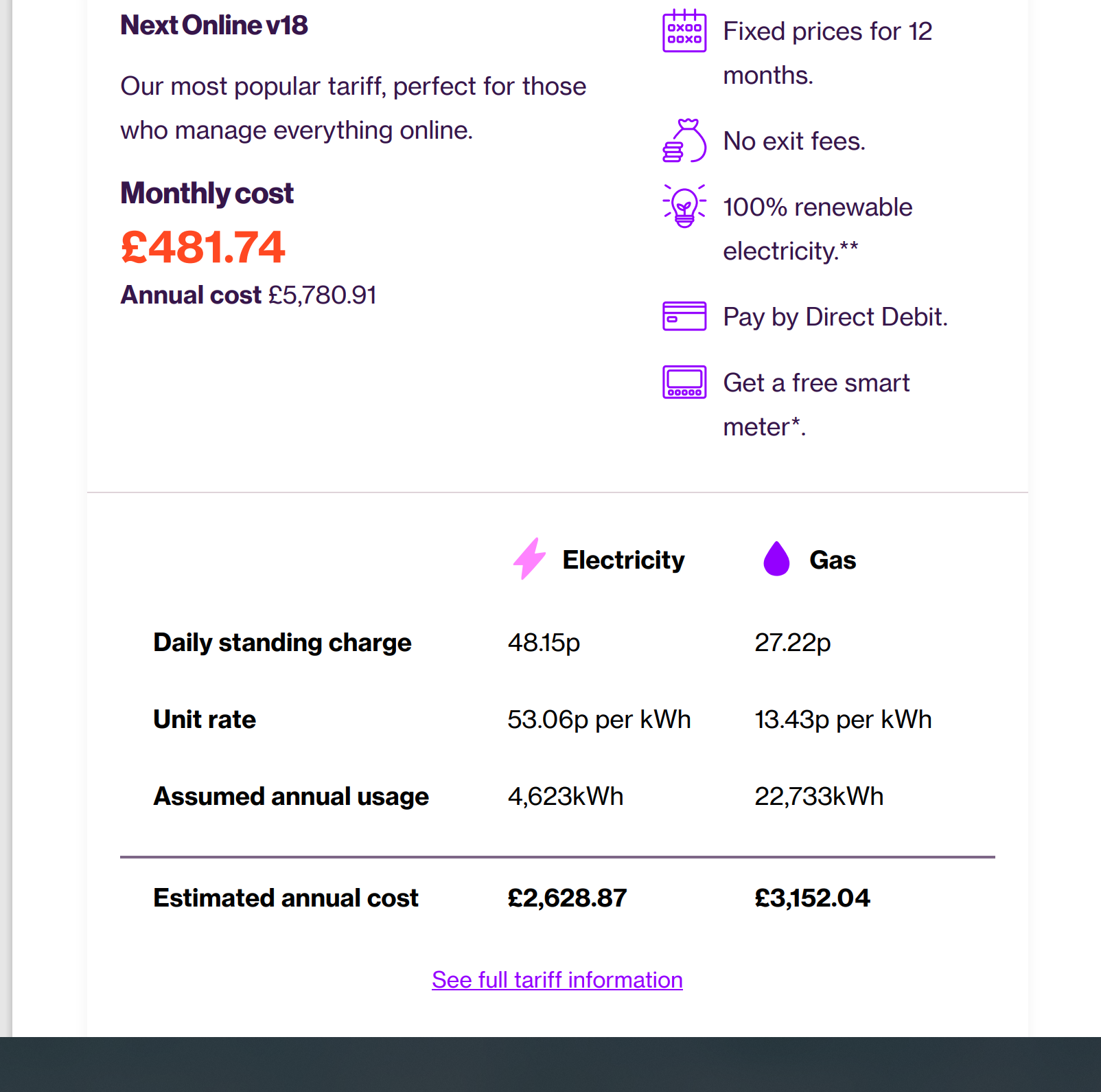 victor2 said:oldagetraveller1 said:What is the tariff for this eon next v18 fix?I am on an earlier 12 months fix with them but they make it impossible to view what tariffs are available.When I try for a quote there's just a message advising not to change. That's up to me if I could see what's available. I can then decide whether to remain on my existing fix or not!