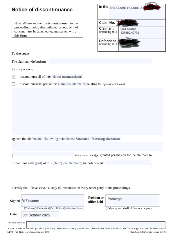 Two discontinuances reported by super sleuth @Solihillers as above - thank you Ma'am - both UKPC cases. To save kilobytes, let's house them both in this post!Please note, we are not a legal advice forum. I personally don't get involved in critiquing court case Defences/Witness Statements, so unable to help on that front. Please don't ask. .