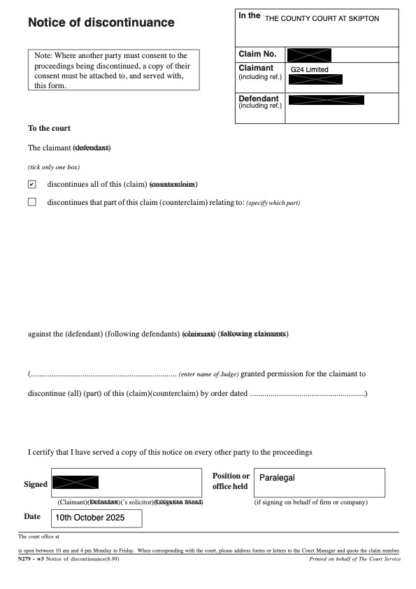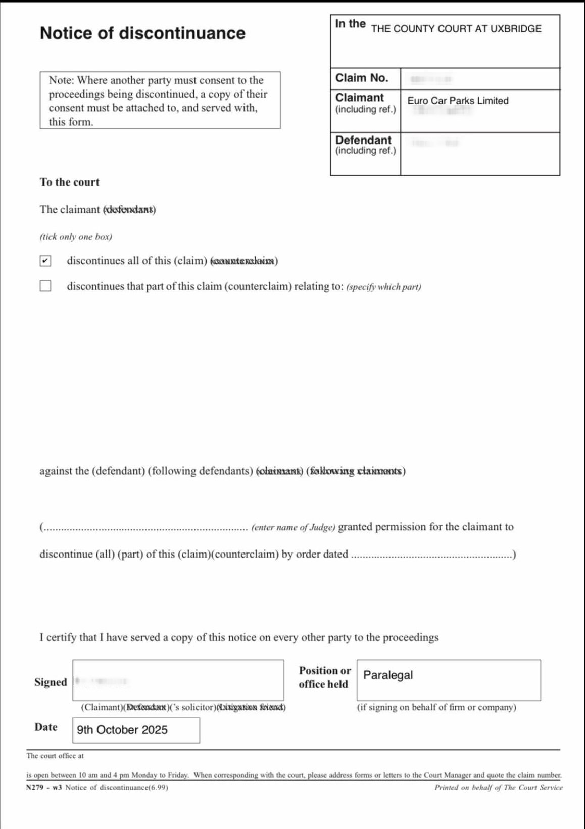 I refer to the N279 (Notice of Discontinuance) filed/served in this matter. The signature block describes the signatory as “claimant’s solicitor”, position “paralegal” at DCB Legal, with the name shown as “[initial] [surname]”.