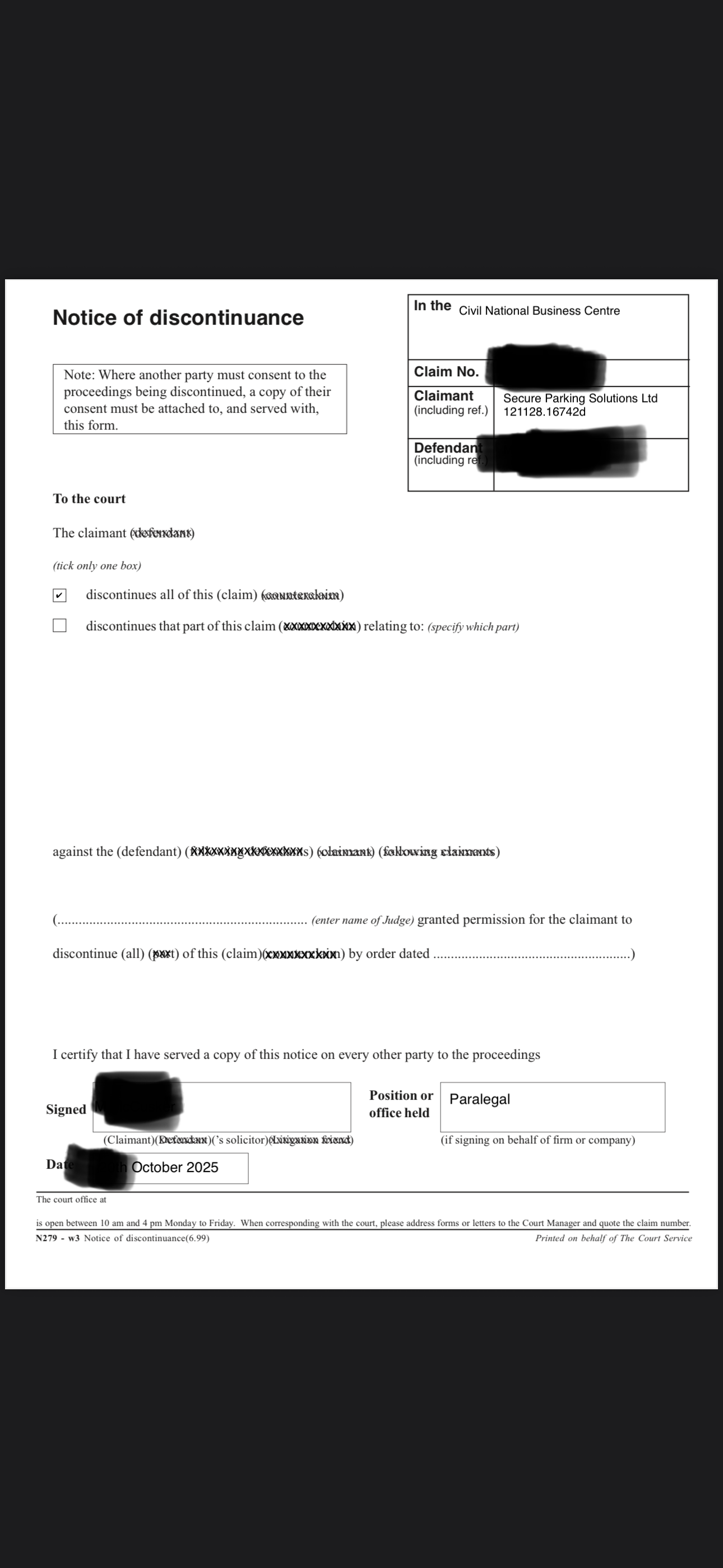 @Astro212 turfs out Secure Parking Solutions and DCB Legal and delivers in the process discontinuance #692Please note, we are not a legal advice forum. I personally don't get involved in critiquing court case Defences/Witness Statements, so unable to help on that front. Please don't ask. .