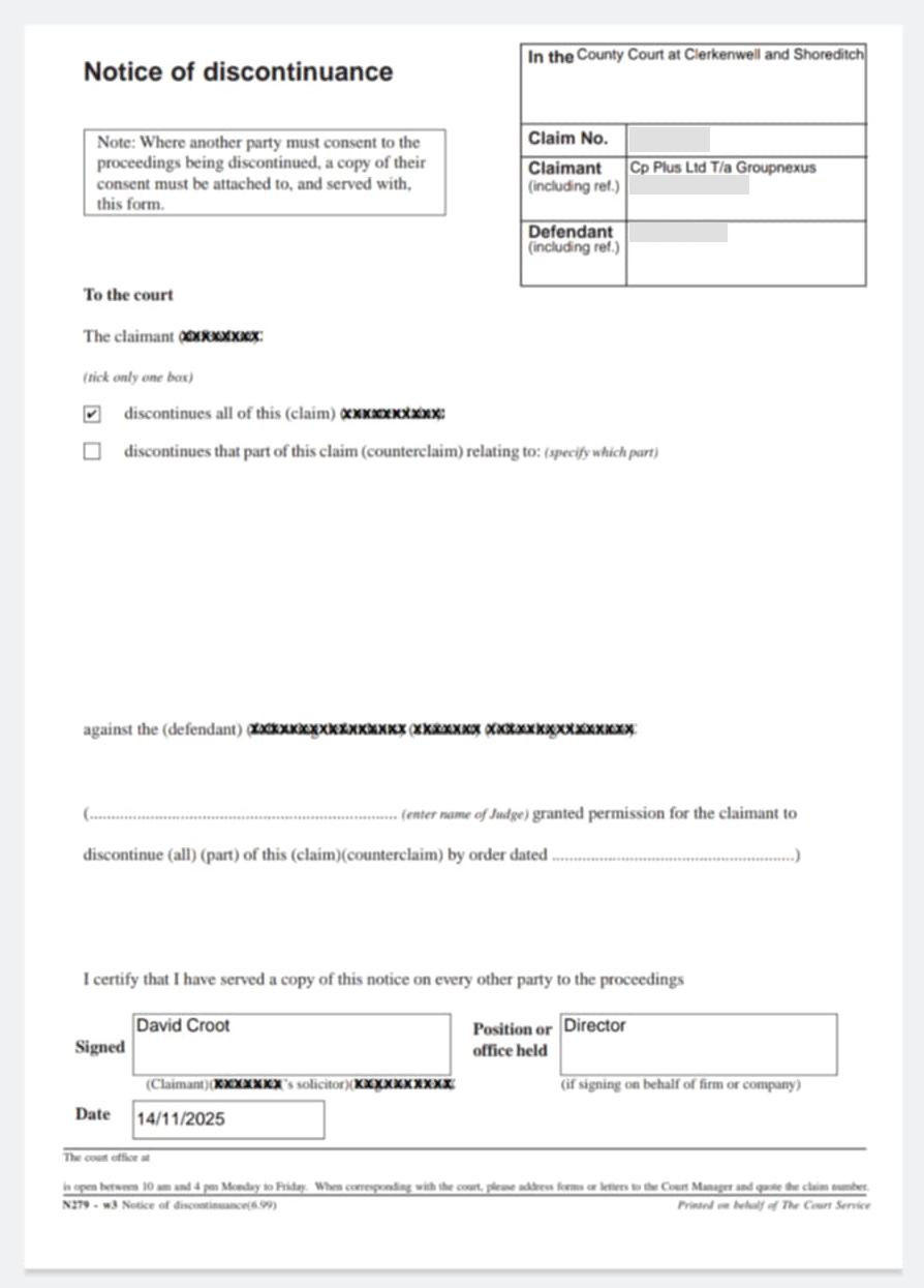 👆👆 Once again, thank you @kryten3000. Numbers totting up every day. ECP and DCB Legal put to the Facebook sword! Discontinuance #703Please note, we are not a legal advice forum. I personally don't get involved in critiquing court case Defences/Witness Statements, so unable to help on that front. Please don't ask. .