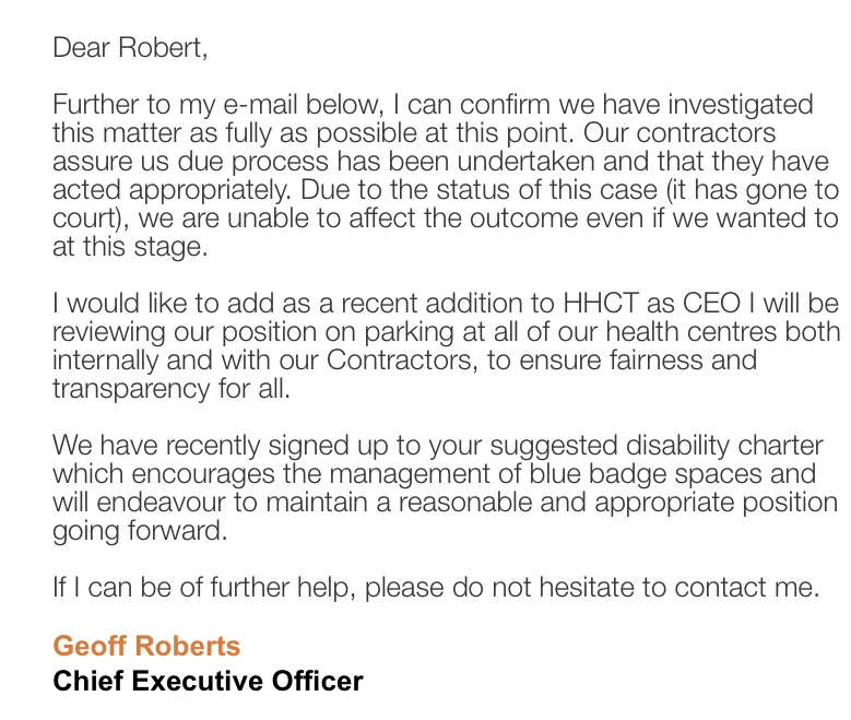Still disappointed though that no one seems to be taking on board that the blue badge scheme doesn’t apply on private land and the Equality Act does….. but I guess there’s no money to be made in that. After all the contractors have assured the health trust that due process has been undertaken.1